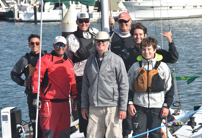 Aboard Chip Merlin’s Merlin, the Bill Lee 68 sled, foredeck crew Dale Scoggin recounted some mishaps. “The first race we did everything well as far as boat handling, tactics, then afterward we heard on the radio the second-place boat Adjudicator protesting Merlin for sailing around the wrong second windward mark. The Fort Mason buoy was the actual mark. We went around another buoy that we assumed was the mark. Then we re-read the description and realized that is was the yellow can, actually.”