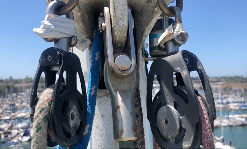 3. Another item to inspect are all halyards, especially where they pass over a sheave at the mast head (or through a block, in the case in spinnaker halyards) when tensioned. When circumnavigating the Pacific I would regularly inspect the rig before any long passages, and we found chafe severe enough to merit replacing the jib halyard once and the spinnaker halyard once (each after somewhere on the order of 10,000 – 15,000 miles of sailing). Having had some notion of this possibility, as well as an obsession for tools and spares, we were carrying a spare for each — which were put to good use!
