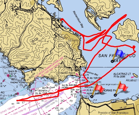 “As usual we chose our route based on wind and tide by first heading for Raccoon Strait, but fog shrouded Richmond, so we jibed and headed for the Gate, which had no fog. What? It was a great experience to sail out past Point Bonita and back under the Bridge with only one tack, which was done to avoid traffic.