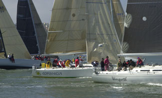 Coastal Cup a Quick One?June 17 - California Coast We haven't heard any results yet, but the Coastal Cup from San Francisco to Catalina, which started the same time as the Singlehanded TransPac, must have been a fast one. According to the weather buoys, the wind held at between 19 and 30 knots through the night, so as long as they didn't die at the east end of the Santa Barbara Channel, they should have done all right. Here's some of the boats starting. ![]() First start ![]() Eclipse at Mile Rock |