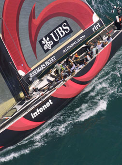 ![]() Alinghi sails upwind in Race 5 Photo Bob Grieser/Louis Vuitton Cup ![]() Defeated champions Team New Zealand now go into Challenger mode. Photo Louis Vuitton Cup |