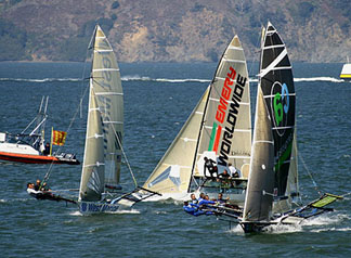 Aussie 18s: It's No Game for KidsSeptember 1 - San Francisco ![]() Patrick Whitmarsh's Sunrise team crosses Howie Hamlin's West Marine. The third annual 18 Skiff International Regatta on San Francisco Bay continues through Friday. Rich Roberts reports: John Winning has been racing what may be the world's most temperamental sailboat for 29 years, or since before some of his rivals were born. He won the class's Giltinan classic - unofficially, the world title - in 2000 and, at 52, is still ranked second in the world. The Australian veteran has learned that the little things count, as they did yesterday (Tuesday) when he and his crew of Euan McNicol and Jack Young sailed Computer Associates to a sweep of both races in front of the host St. Francis Yacht Club. ![]() John Winning (right) with crew Euan McNicol and Jack Young won both races Tuesday. That left them one point behind countryman Trevor Barnabas and six up on third-place Californian Howie Hamlin - who, incidentally, admit to 52 and 51 birthdays, respectively - with four of nine races sailed in the competition scheduled through Friday. Clearly, it's not a young man's class. ![]() Howie Hamlin's West Marine (left) and John Winning's Computer Associates (right) lead the way out of the start as Dana Jones' Emery Worldwide tacks behind. Everyone dealt with tricky tides and puffy wind of 15 knots blowing through the wind tunnel known as the Golden Gate, but Winning credited a small gear change for the way they breezed wire to wire in both three-lap races around a mile-long windward-leeward course. "We were short on [mast] raking yesterday [Monday]," he said, referring to his opening day pair of thirds. "We were set up for more wind." The tides on his home waters of Sydney Harbour run about 1 knot, while those on San Francisco Bay not only are as strong as 4 knots in either direction but, as Winning said, "In the section we sail it's going in different directions at the same time." Barnabas, with son Trent and Robert Greuter on Omega Smeg, noted that puffs also were a factor. "There's some big gains and losses out there [depending on whether] you tack in breeze or no breeze," he said. The 18s go so fast - often faster than the wind - that all variable factors are magnified into dramatic switches in position. Hamlin followed Monday's pair of seconds with a sixth and a fourth Tuesday but insisted it wasn't because of losing veteran forward crew Rod Howell with a knee injury in Monday's second race. Hamlin scrambled to replace him with Trevor Bozina, a 20-year-old member of the St. Francis junior program who had sailed but never raced on an 18. Mike Martin remained in the middle on West Marine. "Trevor wasn't holding us back," Hamlin said. "He did a great job. The only problem is that we're lighter now. He's 40 pounds less than Rod. That's okay in light wind but not if it blows." There are no weight limits, maximum or minimum, on the 18s. ![]() Dalton Bergan's Vodka Cruiser team (crew Jeff Nelson and Kevin Richards) is in full recovery mode as Howie Hamlin sails past. For more information see www.stfyc.com and www.18footers.com. ![]() Alcatraz was not a mark of the course but a familiar sight along the way. ![]() Sailors were careful not to disturb sunbathers as they hauled their 18 skiffs down to the water. Photos Rich Roberts |