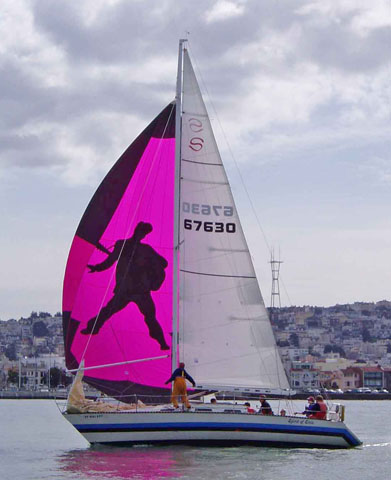 Seaweed Soup Trophy Goes to HarpMarch 6 - San Francisco When the sailing was done in the fifth and final race in Golden Gate YC's midwinter series, the competitors returned to the clubhouse for a hot buffet, cold drinks, and cool trophies. Plaques were awarded to first, second and third place finishers in ten one design and PHRF divisions, and the Manuel Fagundes Seaweed Soup Perpetual Trophy was awarded to Mike Mannix and the Catalina 38 Harp. ![]() Mike Mannix of Harp with the Perpetual Trophy (that'll hold a lot of seaweed soup!) and the take-home plaque. Photo Latitude/Chris This Saturday's conditions were the flukiest of the series, with parking lots popping up as the afternoon wore on, and countless sets and douses. Nevertheless, it was a lovely day to be out sailing. Full results for the series are available at www.ggyc.com/raceresults.php. ![]() Glenn Isaacson's Q sailed to victory in PHRF 2. Photo Latitude/JR ![]() Elvis sighting along the Marina. Actually, it's the Santana 35 Spirit of Elvis sporting a head-turning new chute. Photo Allen Smithee ![]() The Mumm 30 Racer X in PHRF 2 and the J/105 Whisper converge. Photo Latitude/JR |