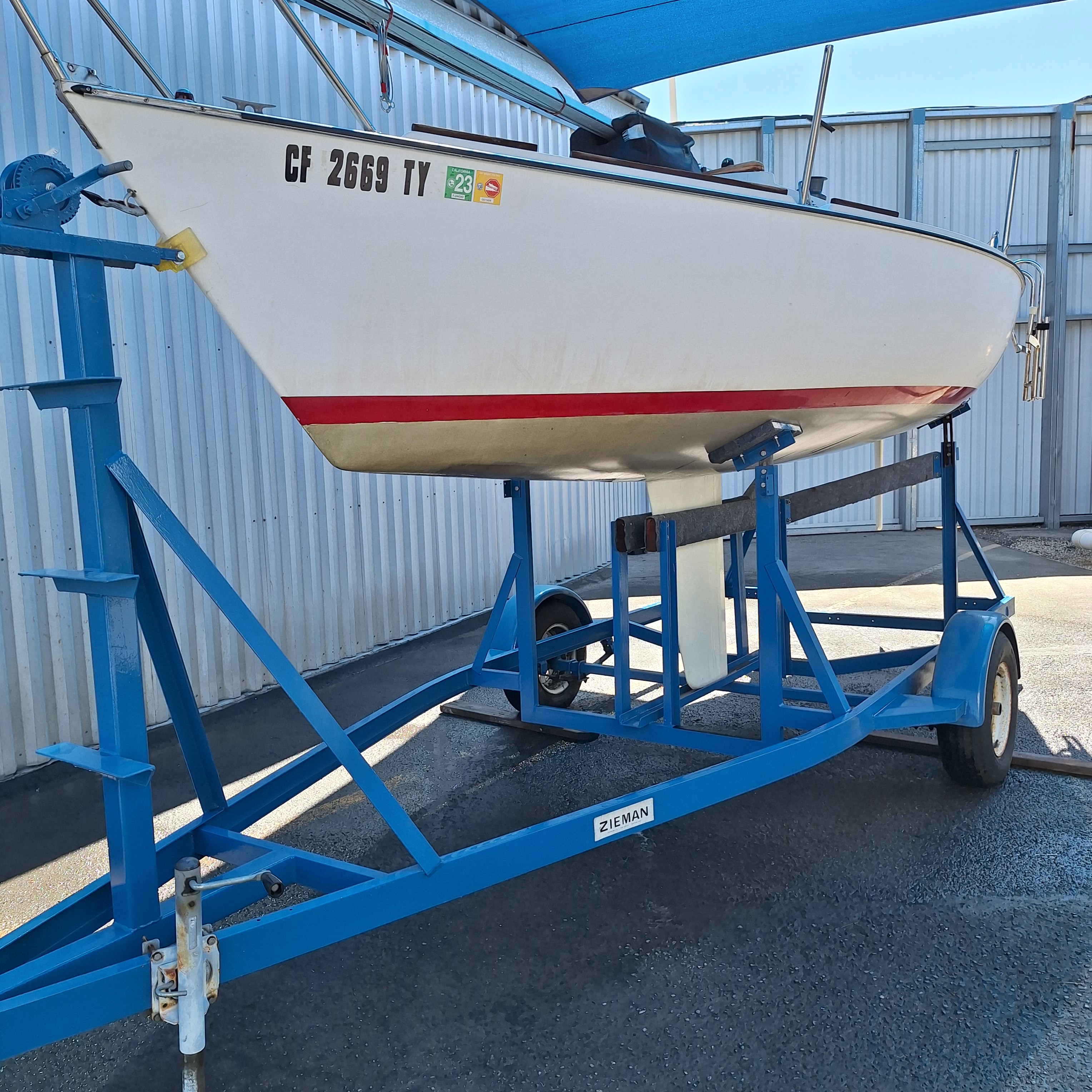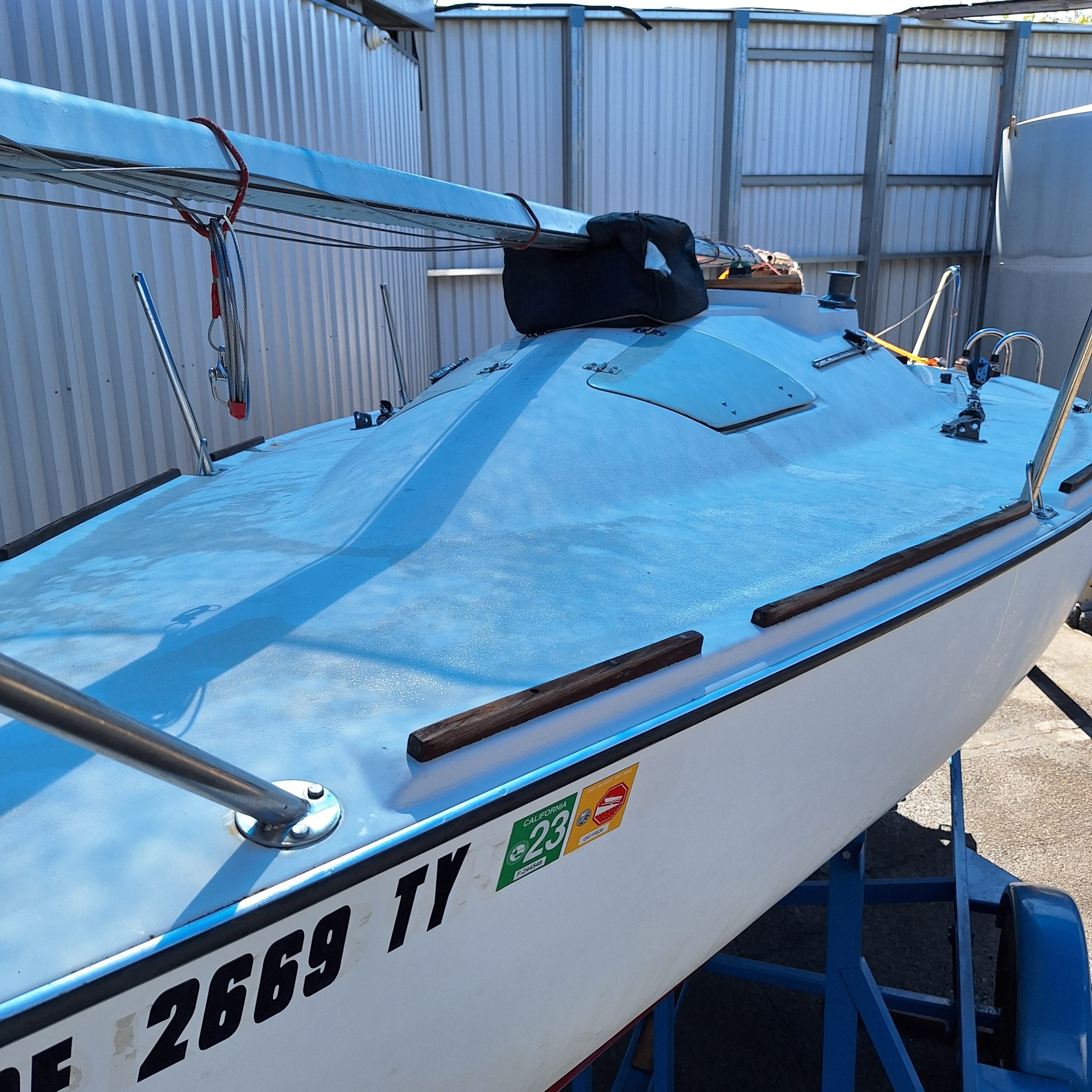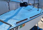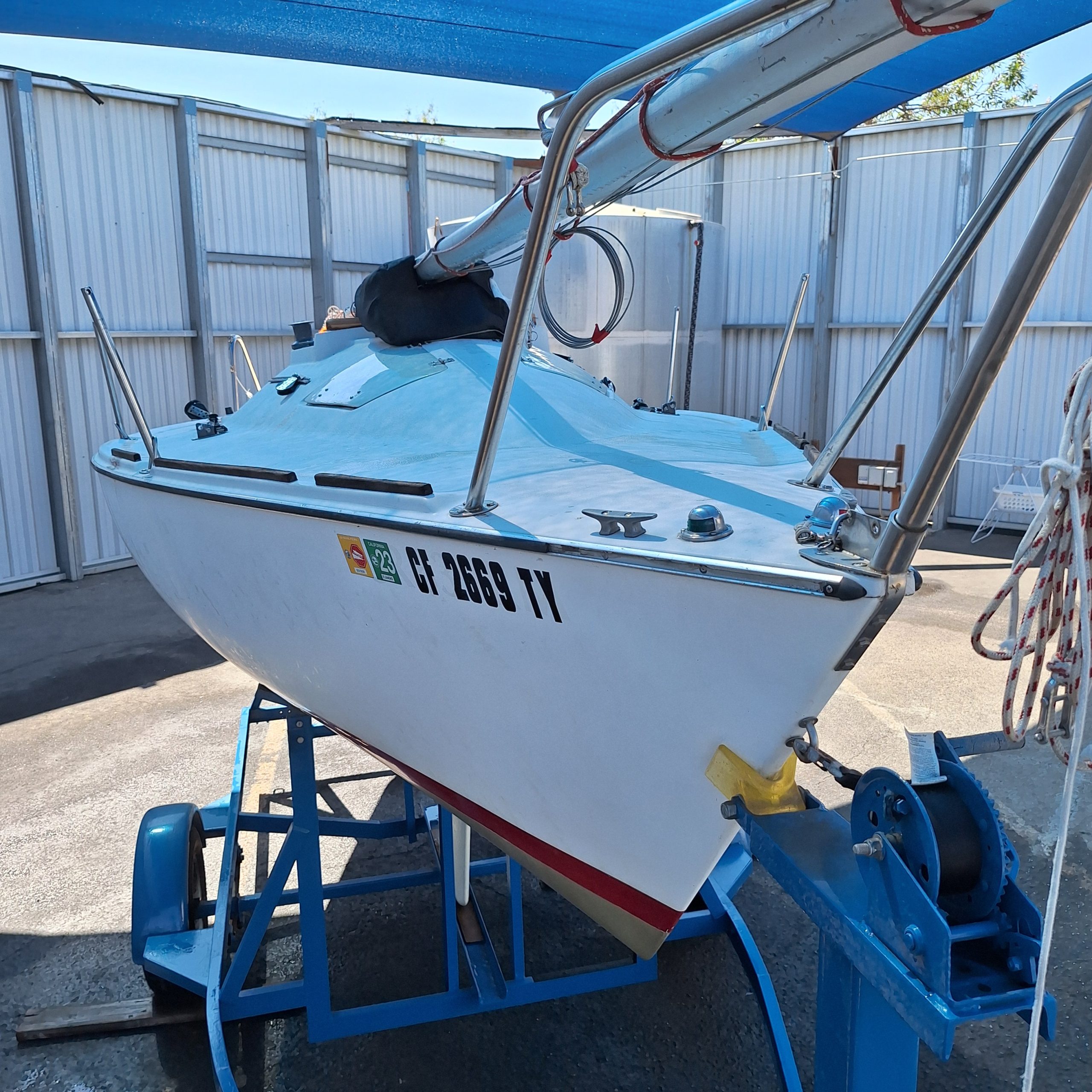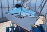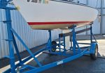 Two working sails, 1 mainsail, 1 spinnaker. Mast step has been reinforced. Rebuilt bulkheads/cabin top to sides to bottom. Removed/glassed thru-hull sensors (prevent leaks). Larger genoa tracks for larger blocks. Wire halyard added to mast. Flared keel. Four coats of West System epoxy resin water repellent on bottom. Bottom not painted. Newly painted trailer. This is a great boat, structurally and appearance. Need to find new owner; I can no longer sail.
