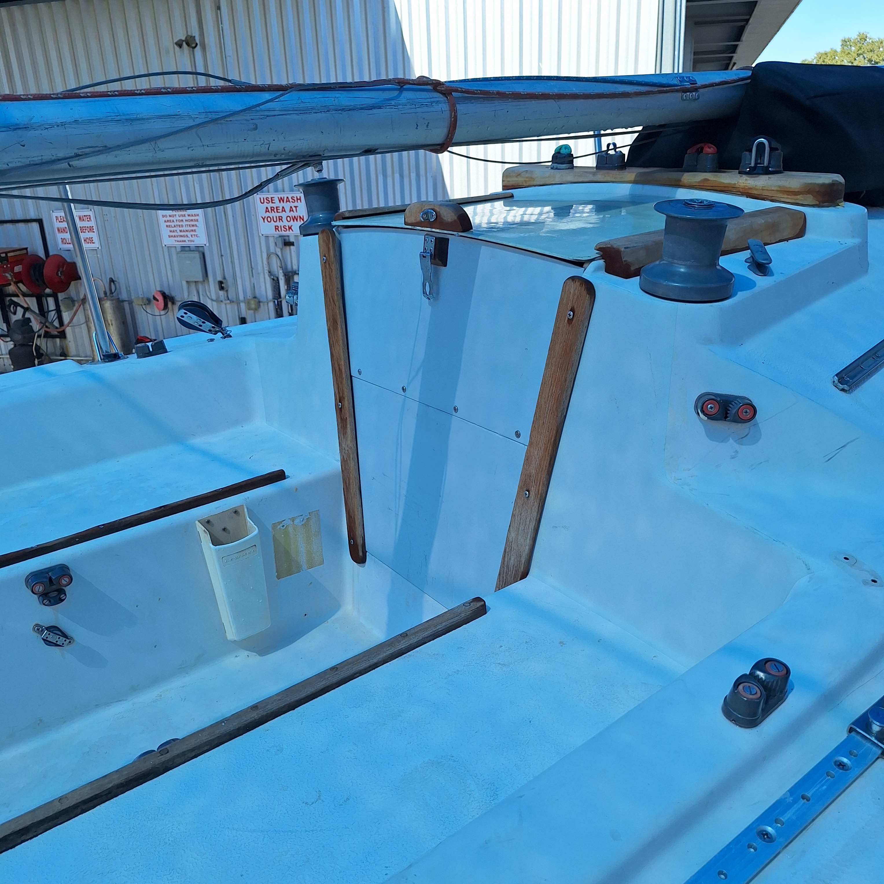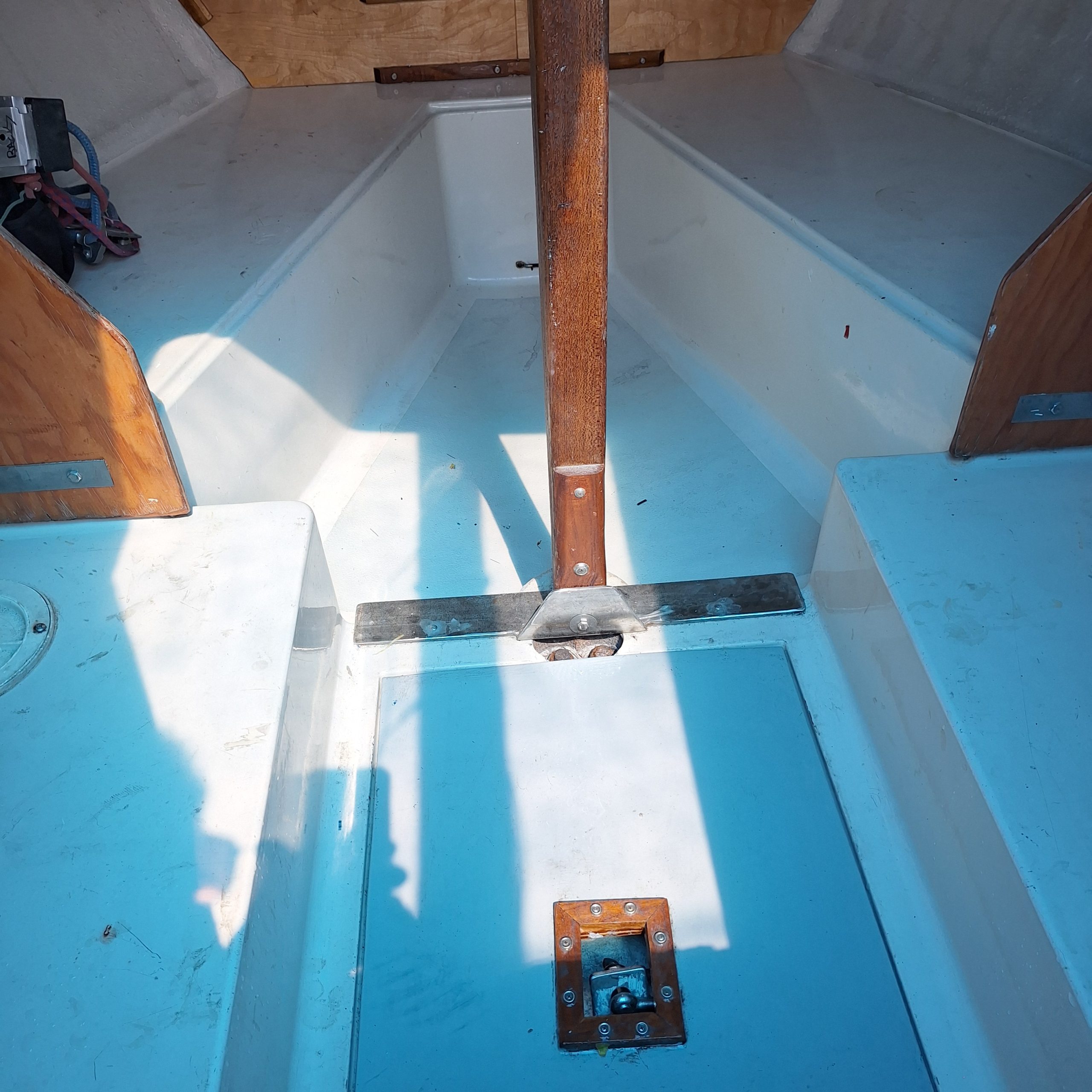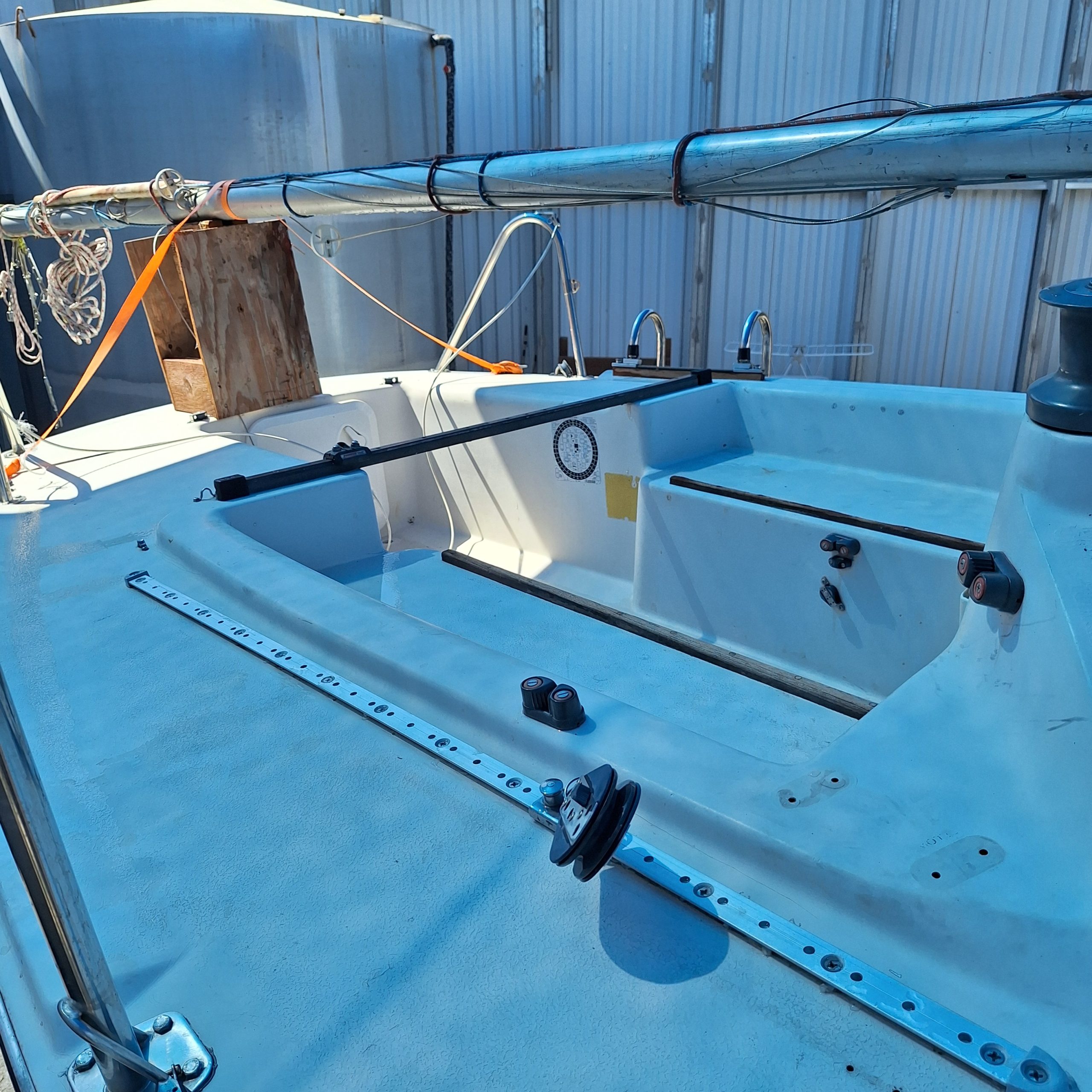 Two working sails, 1 mainsail, 1 spinnaker. Mast step has been reinforced. Rebuilt bulkheads/cabin top to sides to bottom. Removed/glassed thru-hull sensors (prevent leaks). Larger genoa tracks for larger blocks. Wire halyard added to mast. Flared keel. Four coats of West System epoxy resin water repellent on bottom. Bottom not painted. Newly painted trailer. This is a great boat, structurally and appearance. Need to find new owner; I can no longer sail.