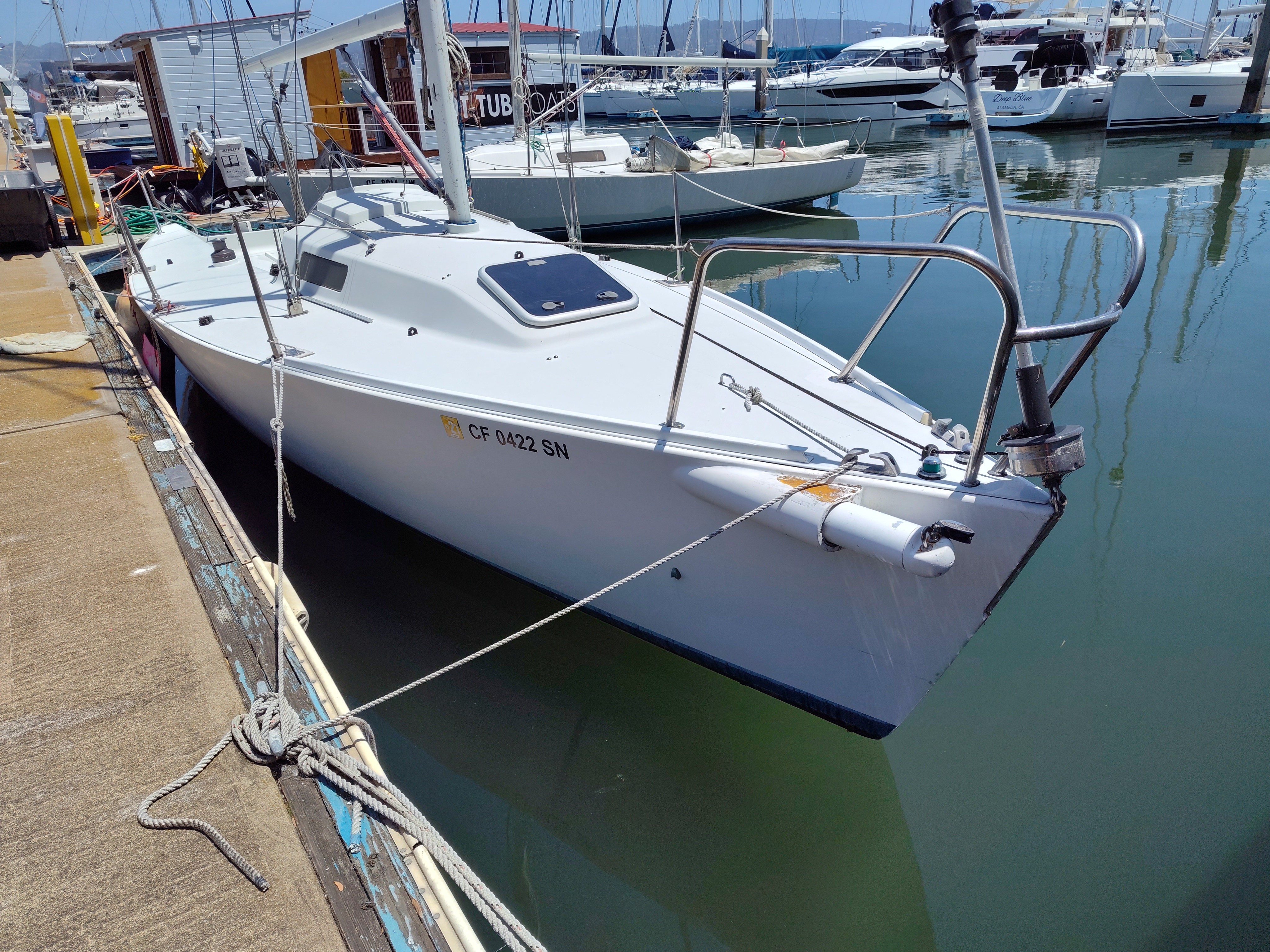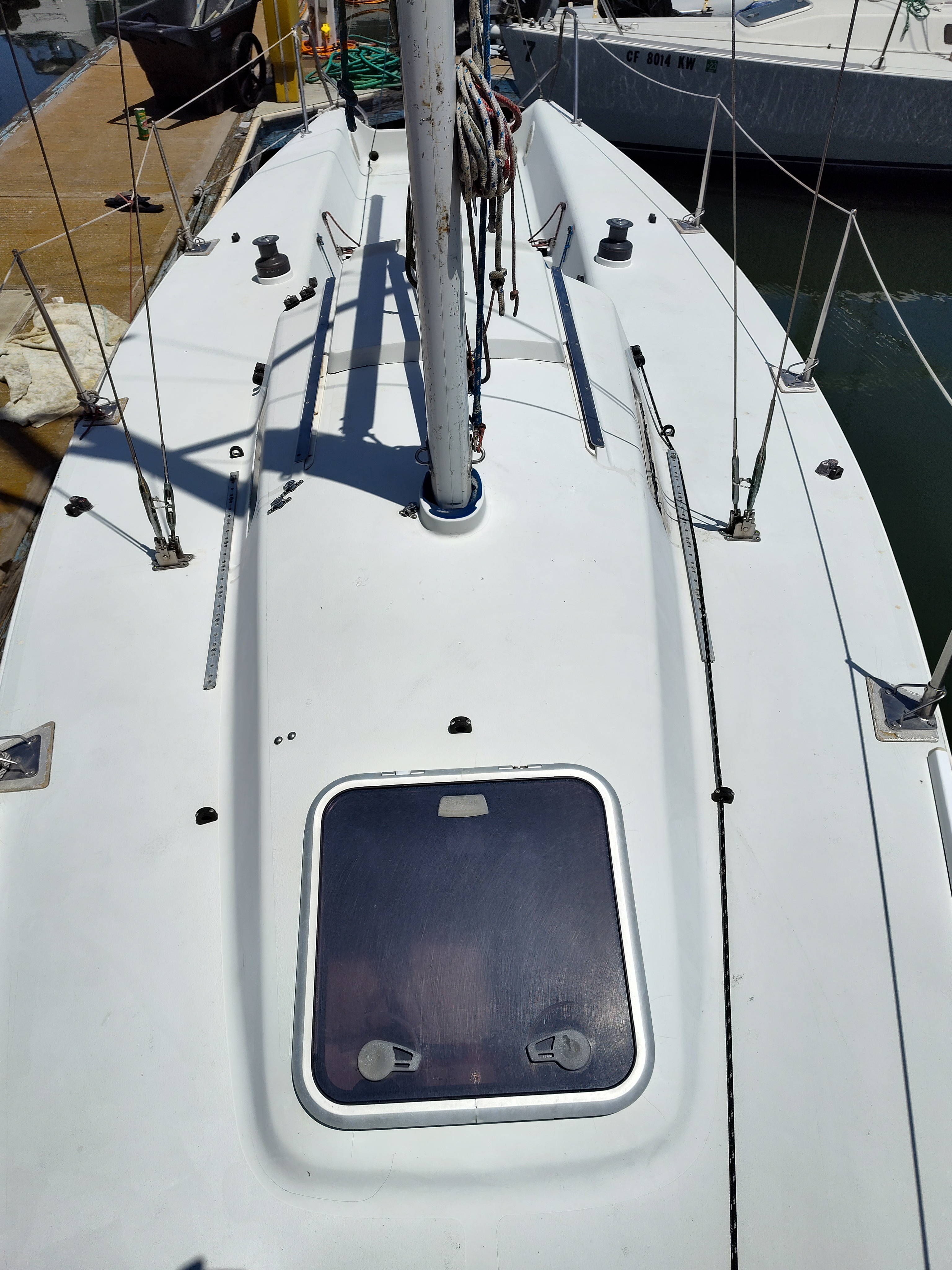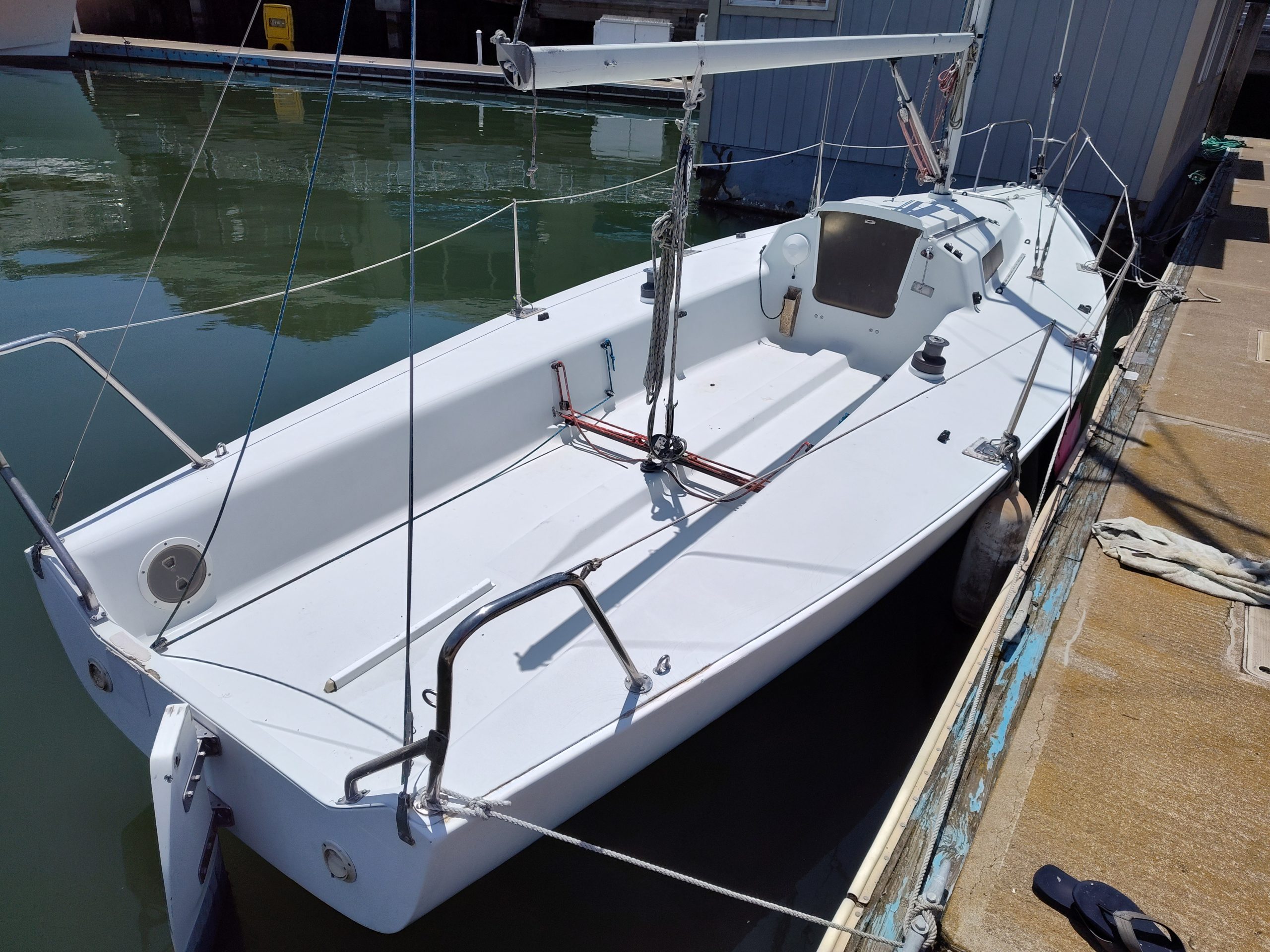 Great family daysailer or club racer. Huge cockpit, high boom, asymmetrical spinnaker. A delight to sail. Comfortable and stable yet nimble and fast. Mainsail, jib, and spinnaker. Priced well below market; here is your opportunity to get a modern sportboat for a reasonable price. More pictures at URL.