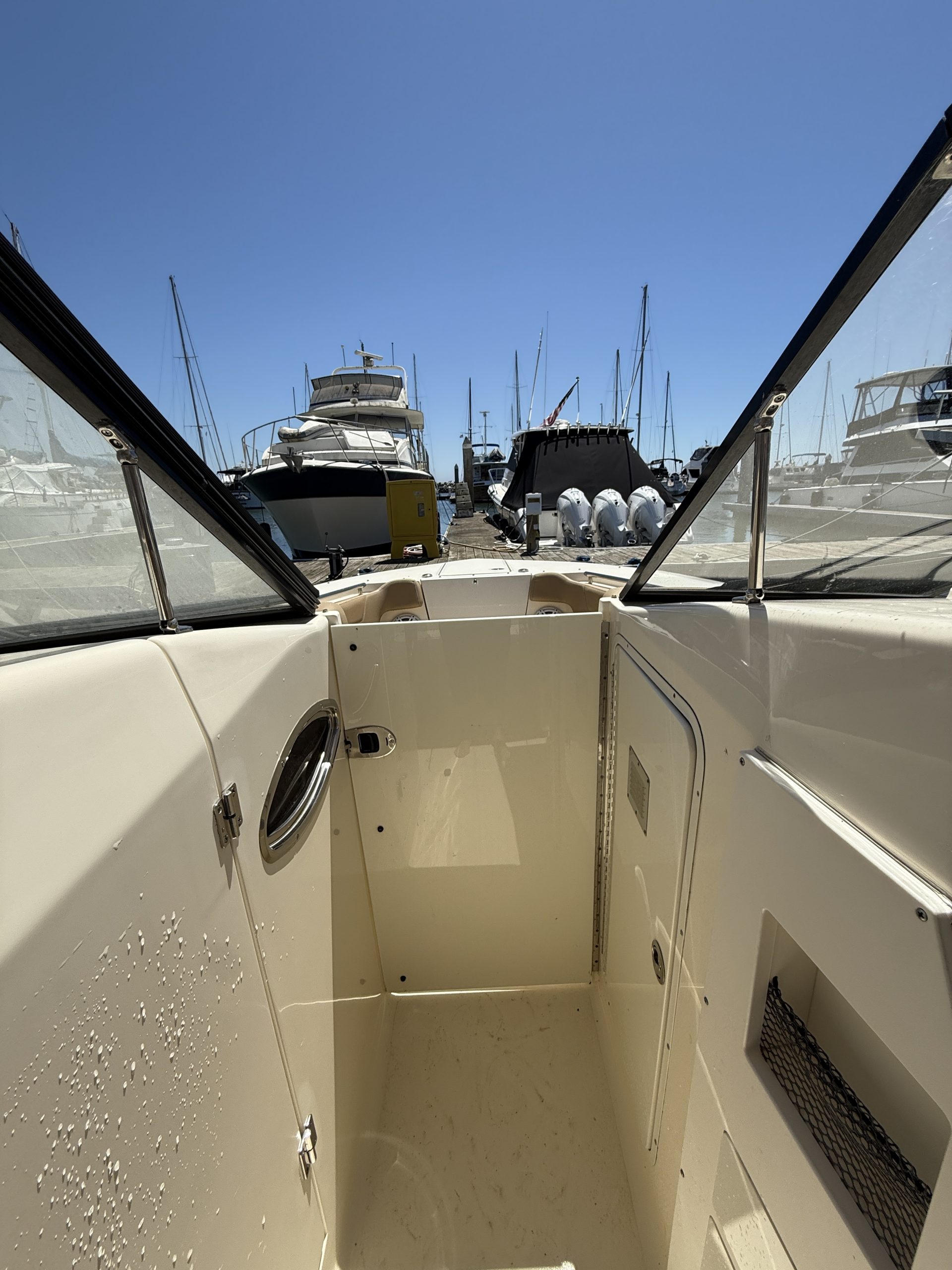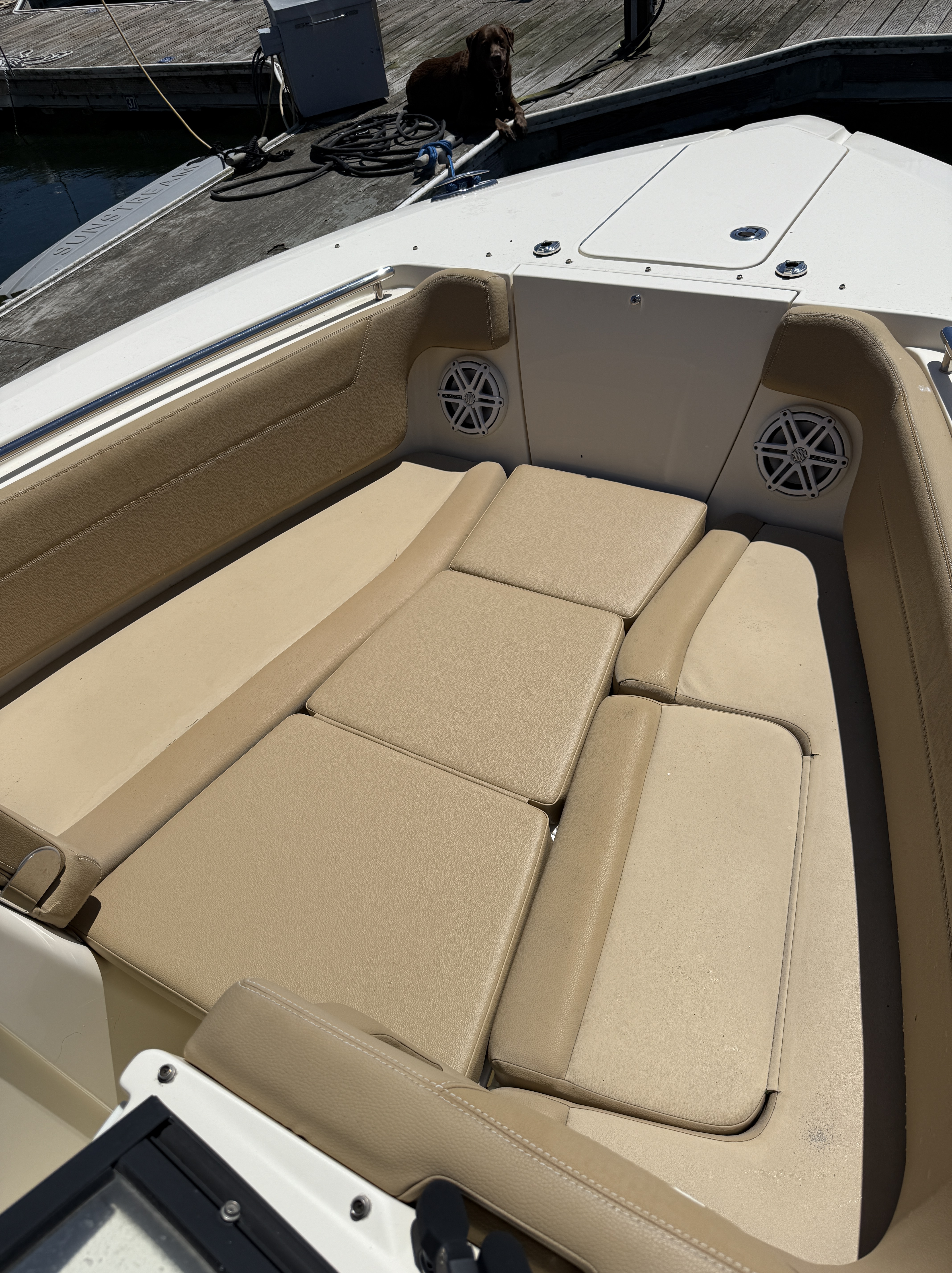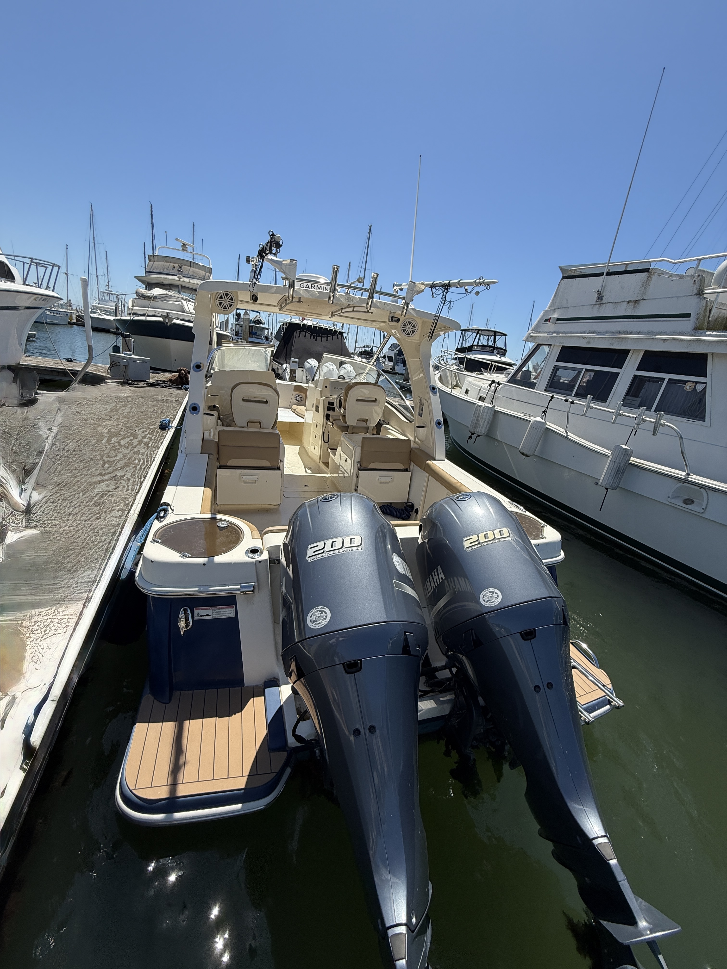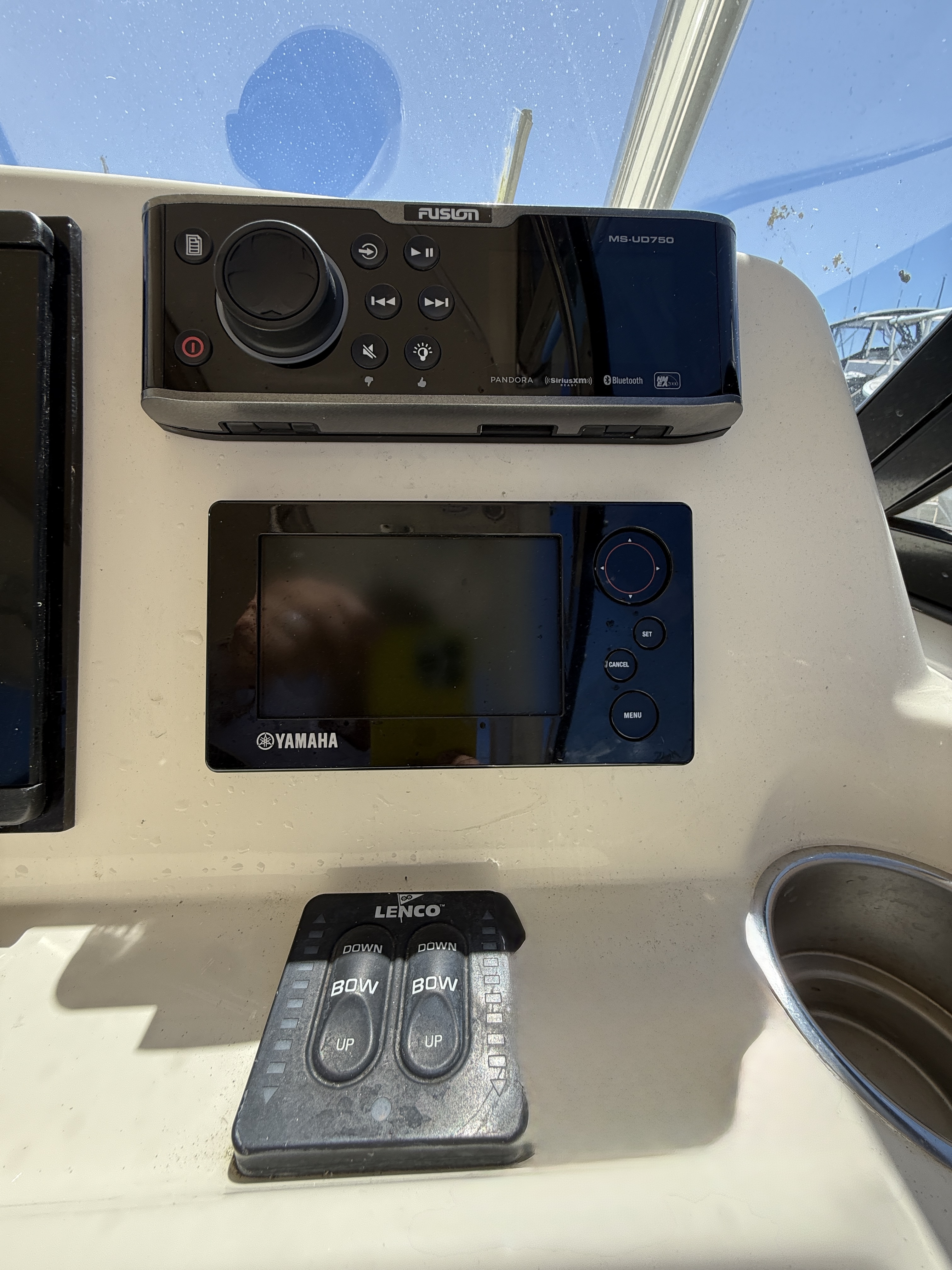 Ready for cruising, fishing, and all watersport activities. Numerous lounging options, telescopic swim ladder, custom fiberglass hardtop, and outstanding fishing features make this a versatile, family-friendly vessel. Multiple aftermarket upgrades include Garmin radar, fishing rod rocket launcher, and custom removable center bow cushion for maximum lounging. Other features: Bluetooth stereo with JL Audio upgrade, electric head upgrade, 152-quart cooler, cockpit sink, LED underwater and cockpit lighting, fold-away stern seat, in-floor fish boxes with pump, rod holders, outriggers, tackle drawers, nine-gallon waste tank, 14-gallon freshwater tank, and 25-gallon bait well. Boat has been drydocked and shrink-wrapped annually, and all required and recommended service/maintenance completed (all records available). Bow and cockpit cover, lines, fenders, life preservers included.