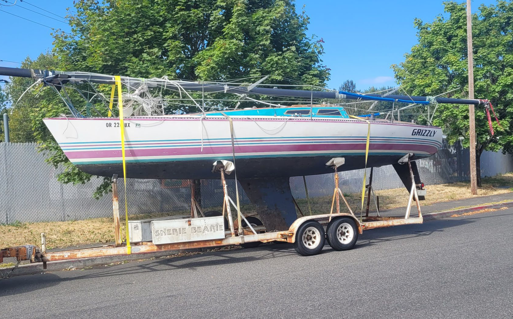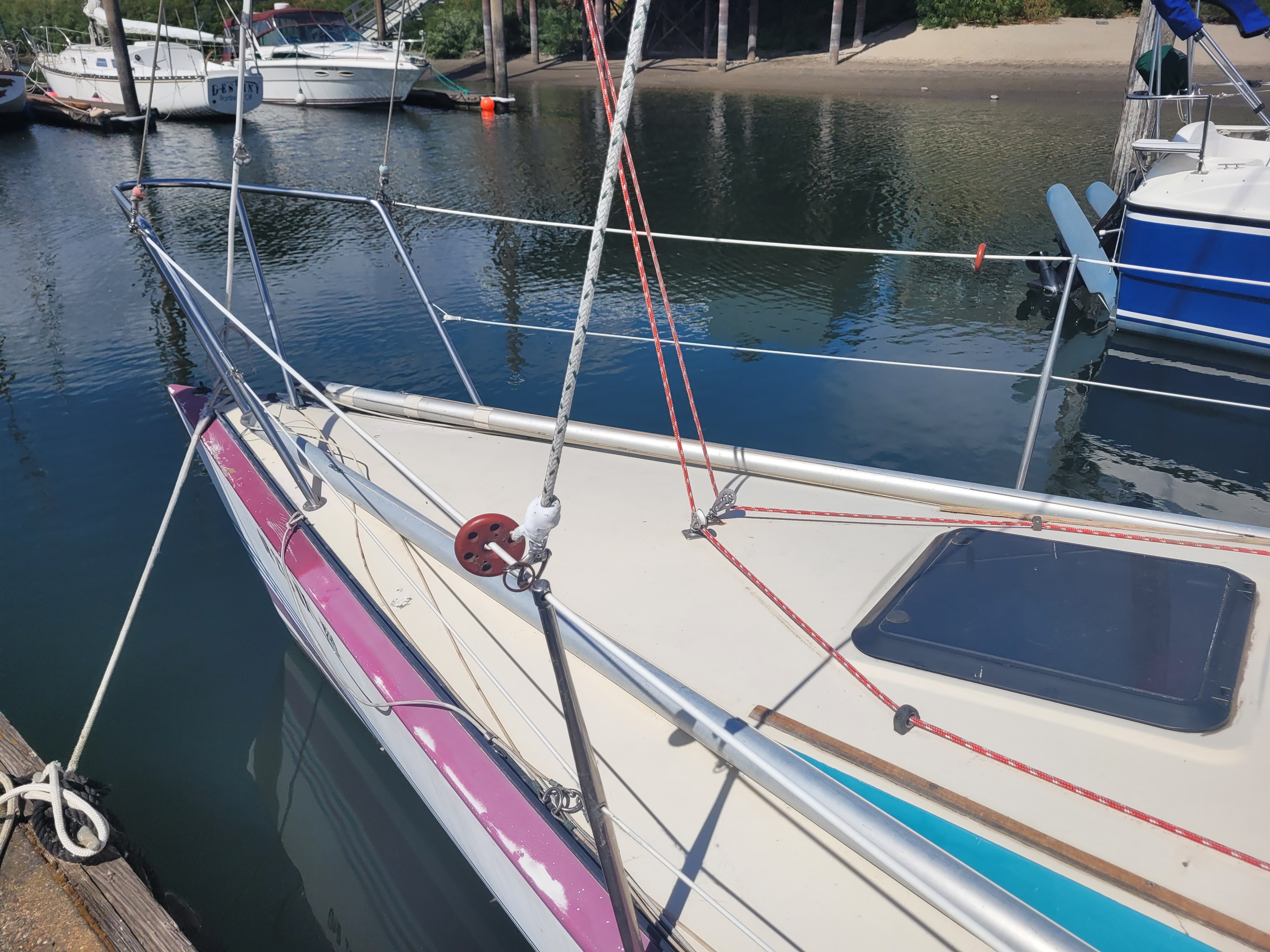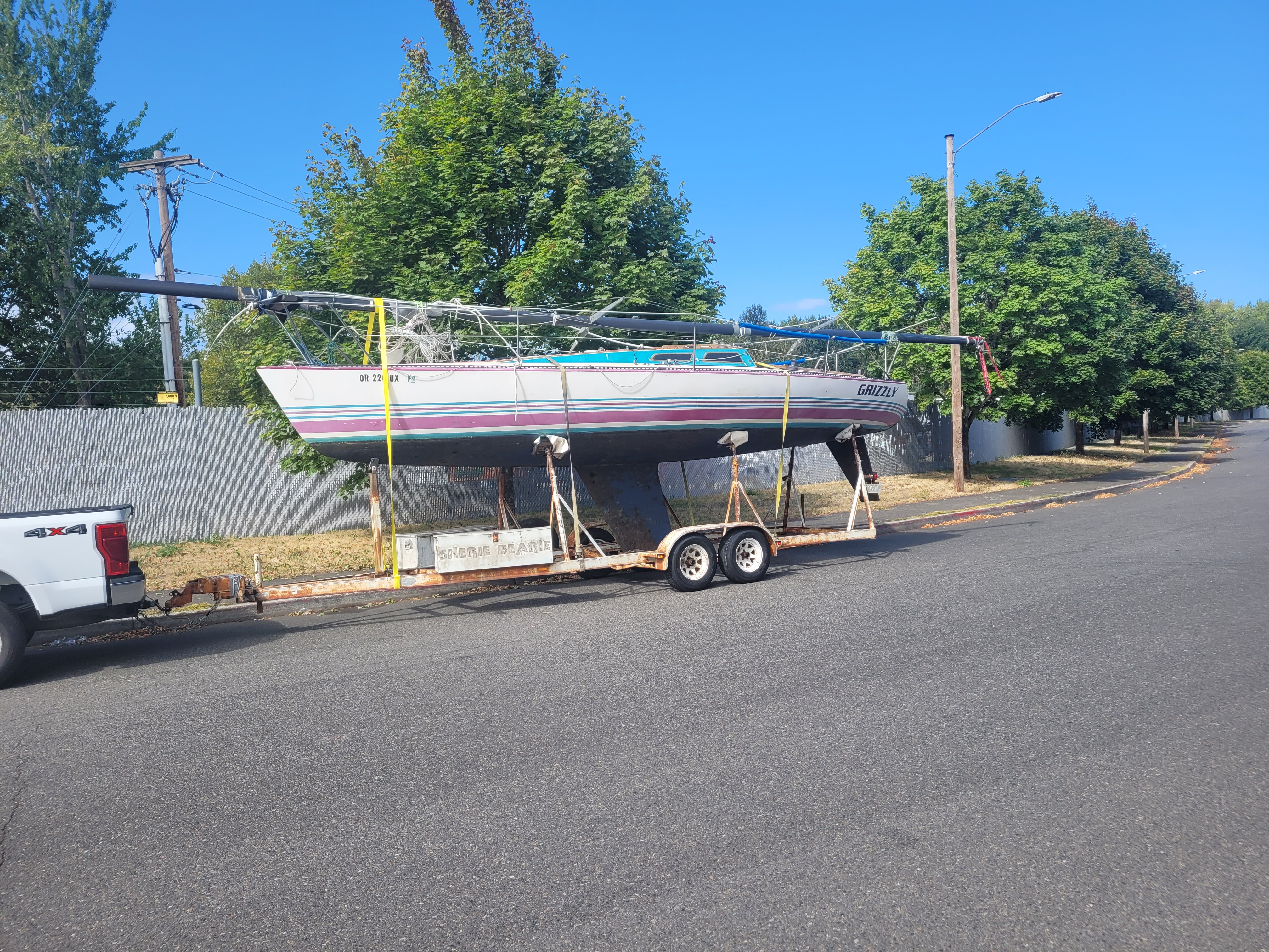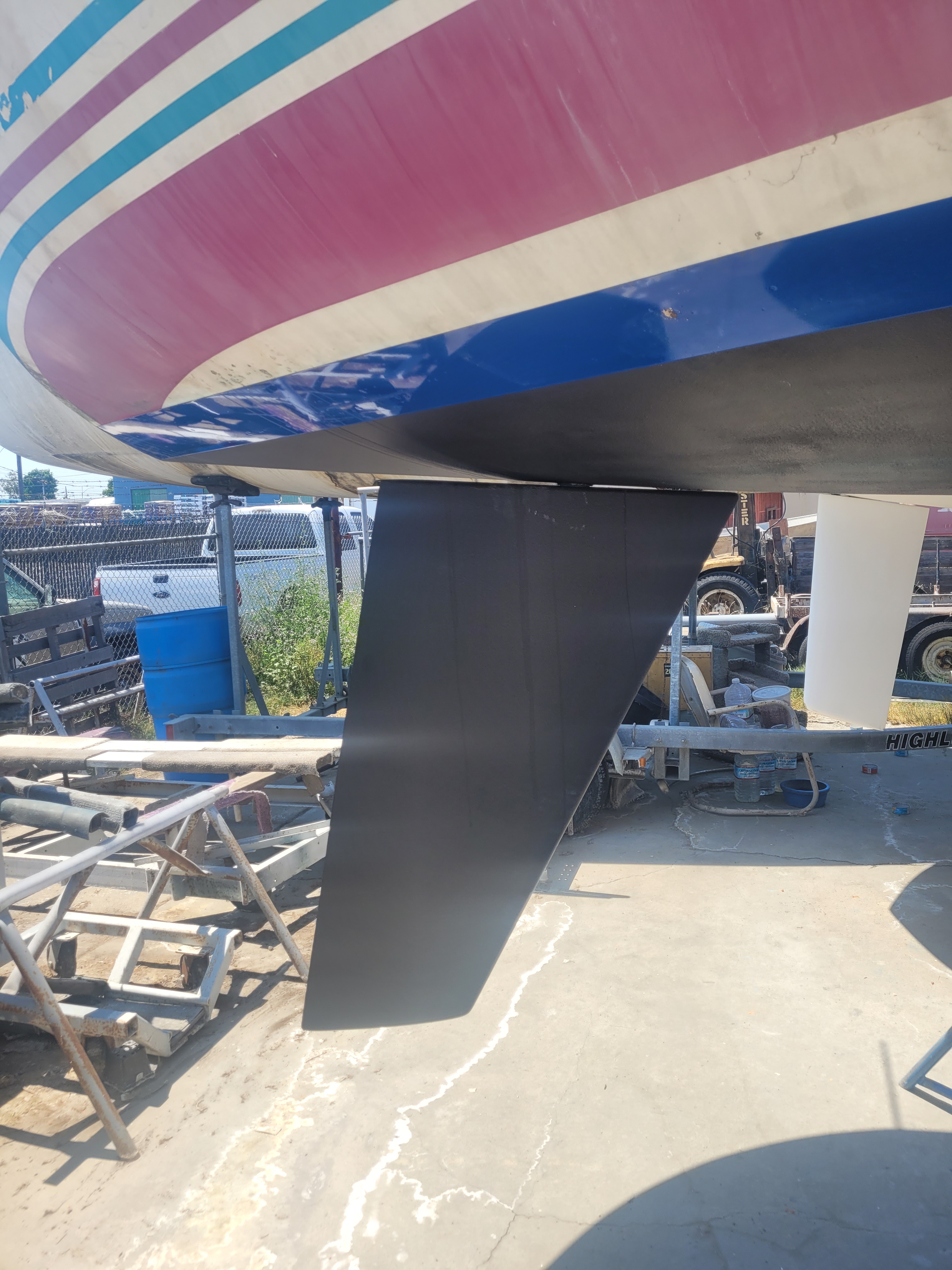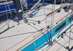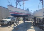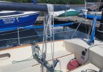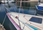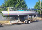 Late model. Includes custom dual-axle trailer and very recent Ballenger double-spreader mast with corresponding rod rigging. Last 20 years in Portland (freshwater). Rigging, stanchions/lifelines, running rigging, winches in excellent condition. Boat has been thoroughly/completely gone through at well-known Elkhorn Composites: A. All three ribs at mast foot replaced with composite elements (boat has substantial jockstrap). B. Three small soft spots in the deck/cockpit replaced w/composite core/gelcoat. C. Bottom and keel completely stripped to the gelcoat and keel fiberglassed as necessary. D. Keel bolts torqued/updated. E. New lifting rod threaded end. F. Several coats barrier, two of Pro-Line antifoul (59% Cu). Mucho $$. Not splashed yet. Two good race mains, spinnakers, older jibs.
