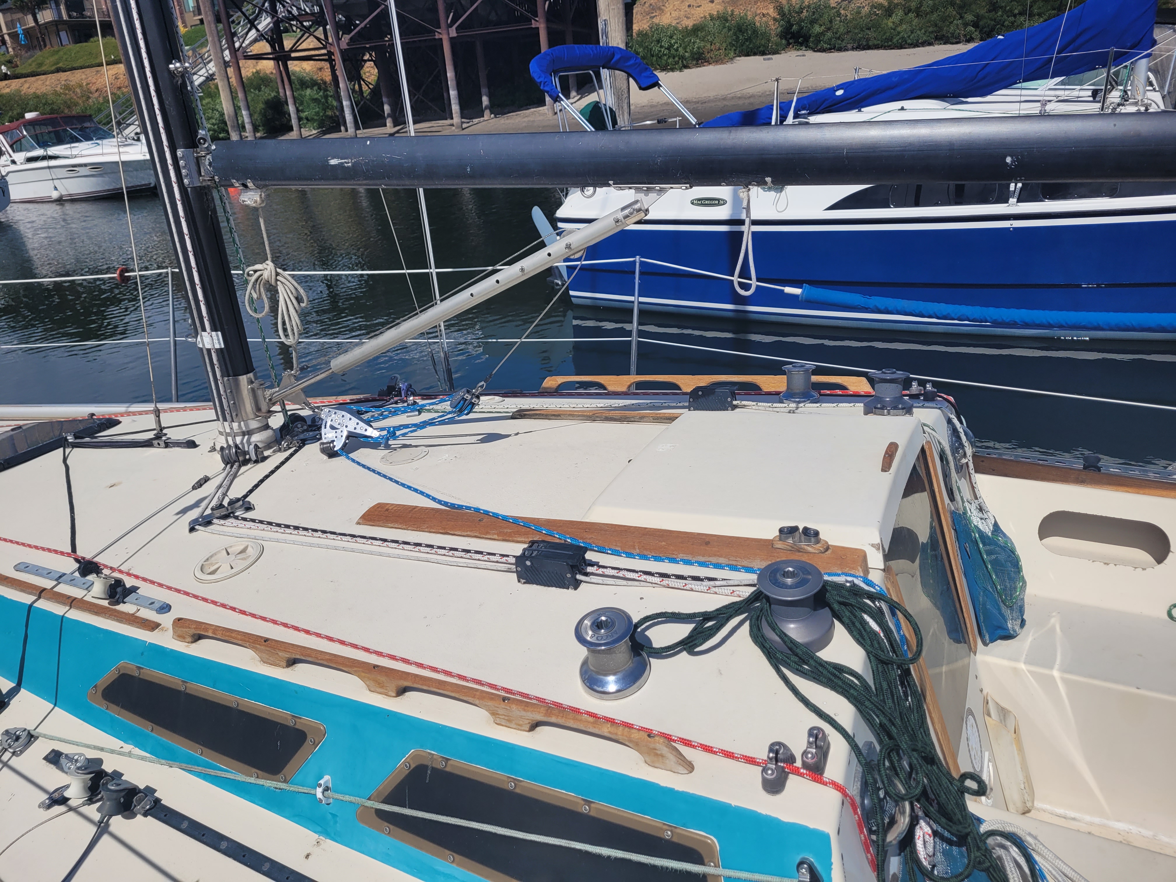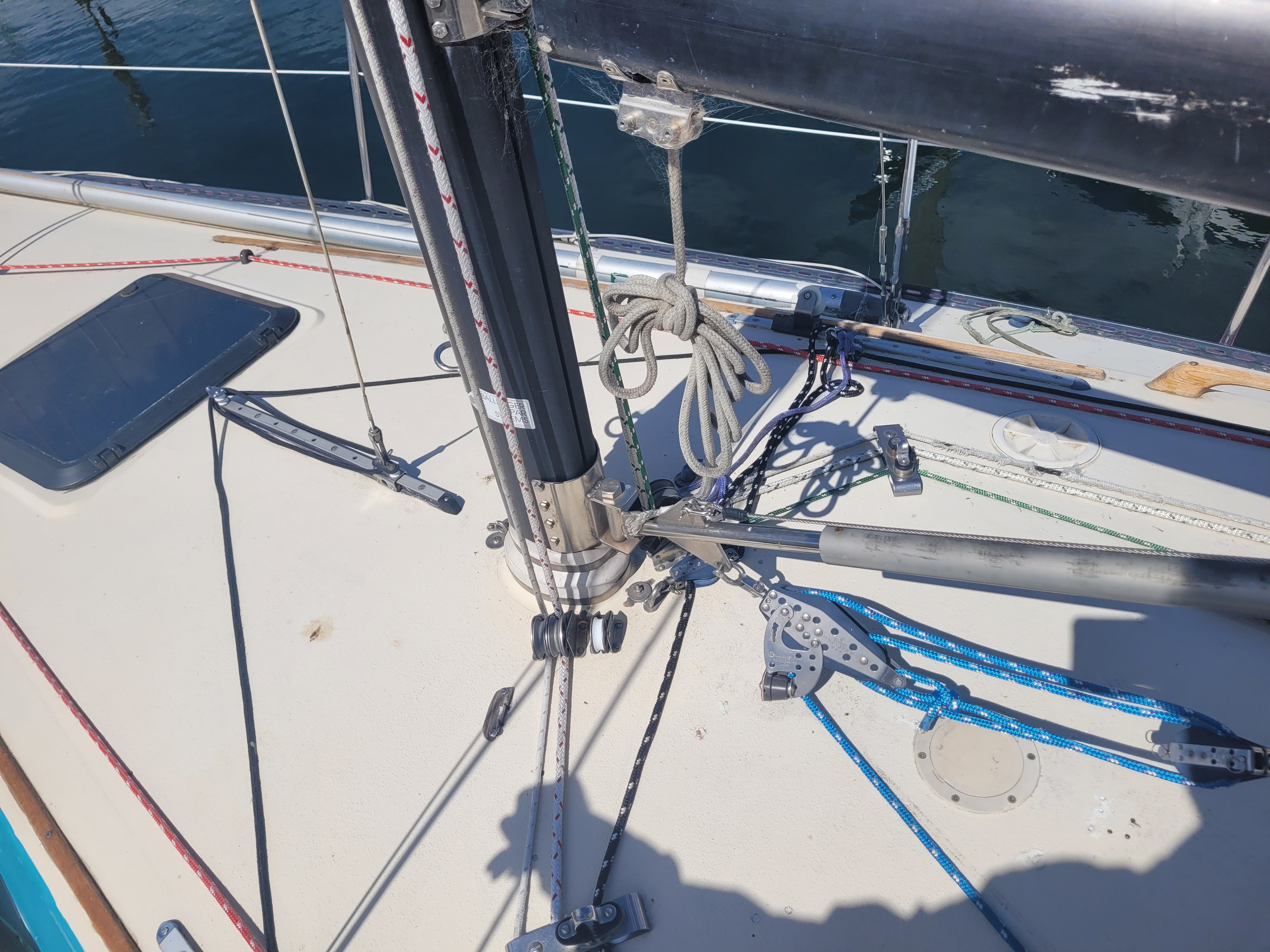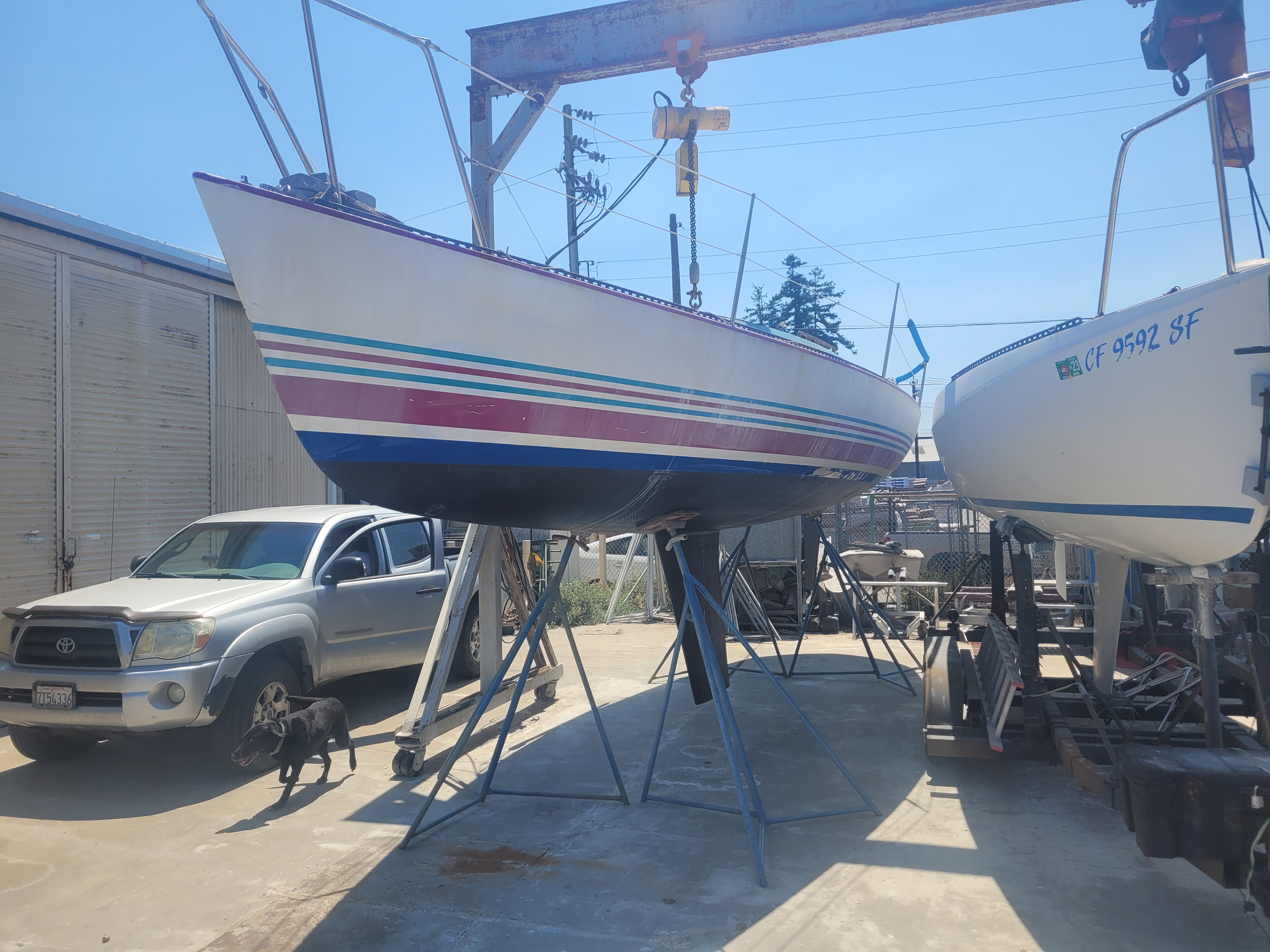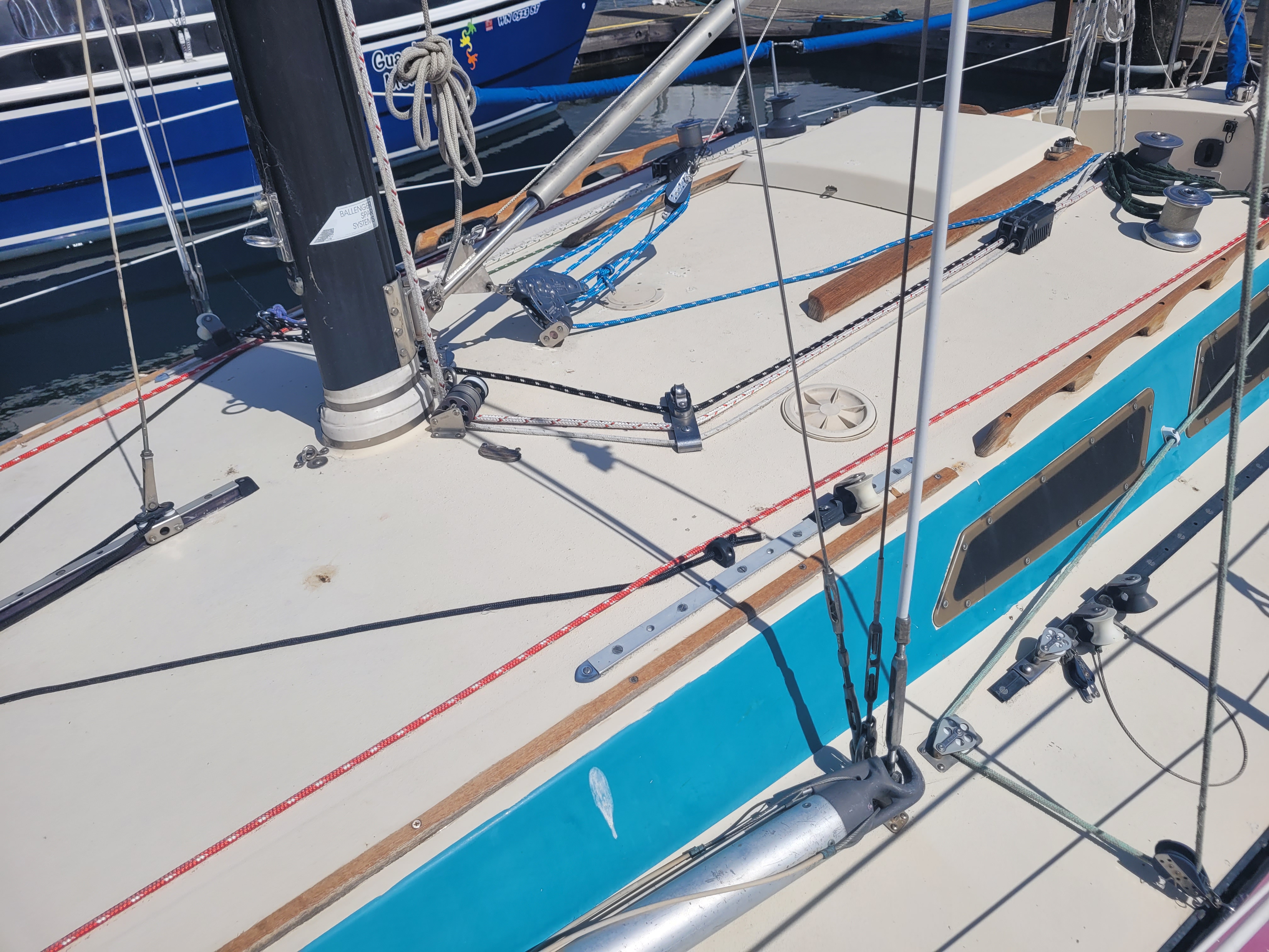 Late model. Includes custom dual-axle trailer and very recent Ballenger double-spreader mast with corresponding rod rigging. Last 20 years in Portland (freshwater). Rigging, stanchions/lifelines, running rigging, winches in excellent condition. Boat has been thoroughly/completely gone through at well-known Elkhorn Composites: A. All three ribs at mast foot replaced with composite elements (boat has substantial jockstrap). B. Three small soft spots in the deck/cockpit replaced w/composite core/gelcoat. C. Bottom and keel completely stripped to the gelcoat and keel fiberglassed as necessary. D. Keel bolts torqued/updated. E. New lifting rod threaded end. F. Several coats barrier, two of Pro-Line antifoul (59% Cu). Mucho $$. Not splashed yet. Two good race mains, spinnakers, older jibs.