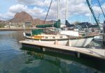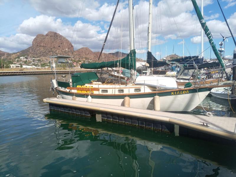 ‘ Kialoa ‘ , recently listed currently on the hard in Guaymas , Sonora , Mexico at Marina Fontur . She is fully equipped with , radar , chart plotter , sideband and vhf radios , electronic autopilot , wind self steering , watermaker , solar charging . The sails and blooper are in very good condition . All ground gear and anchors are in good condition . The bimini and dodger are in excellent condition . Powered by a low hour Beta 30 hp diesel motor . Ready for serious cruising fully equipped with most all backup parts , filters and oil .