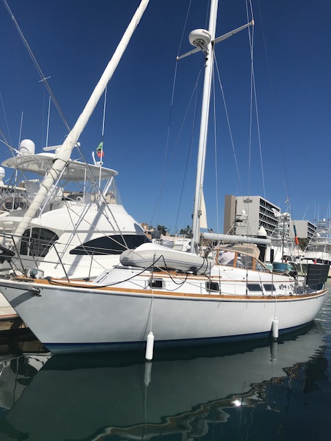 Center cockpit sloop ‘Footloose’ is like new as she has been completely painted with 5 coats of Awlgrip paint (2 primer, 3 coats of paint) $20,000. Completely reupholstered with light gray leather and all-new drapes and dodger canvas ($10,000). New Force 10 propane stove, new Raritan toilet, and all thru-hulls replaced ($10,000). Complete complement of Raymarine electronics including: autopilot, radar, E7 MFD, depthsounder/fish finder. AIS send/receive, 3,500 watt inverter/charger. Beta 4 Kubota diesel (55hp) replaced the old Perkins in 2017 for a total cost of $30,000. In-mast and jib roller furling. Stainless barbecue, swim ladder. Price has been reduced for quick sale.