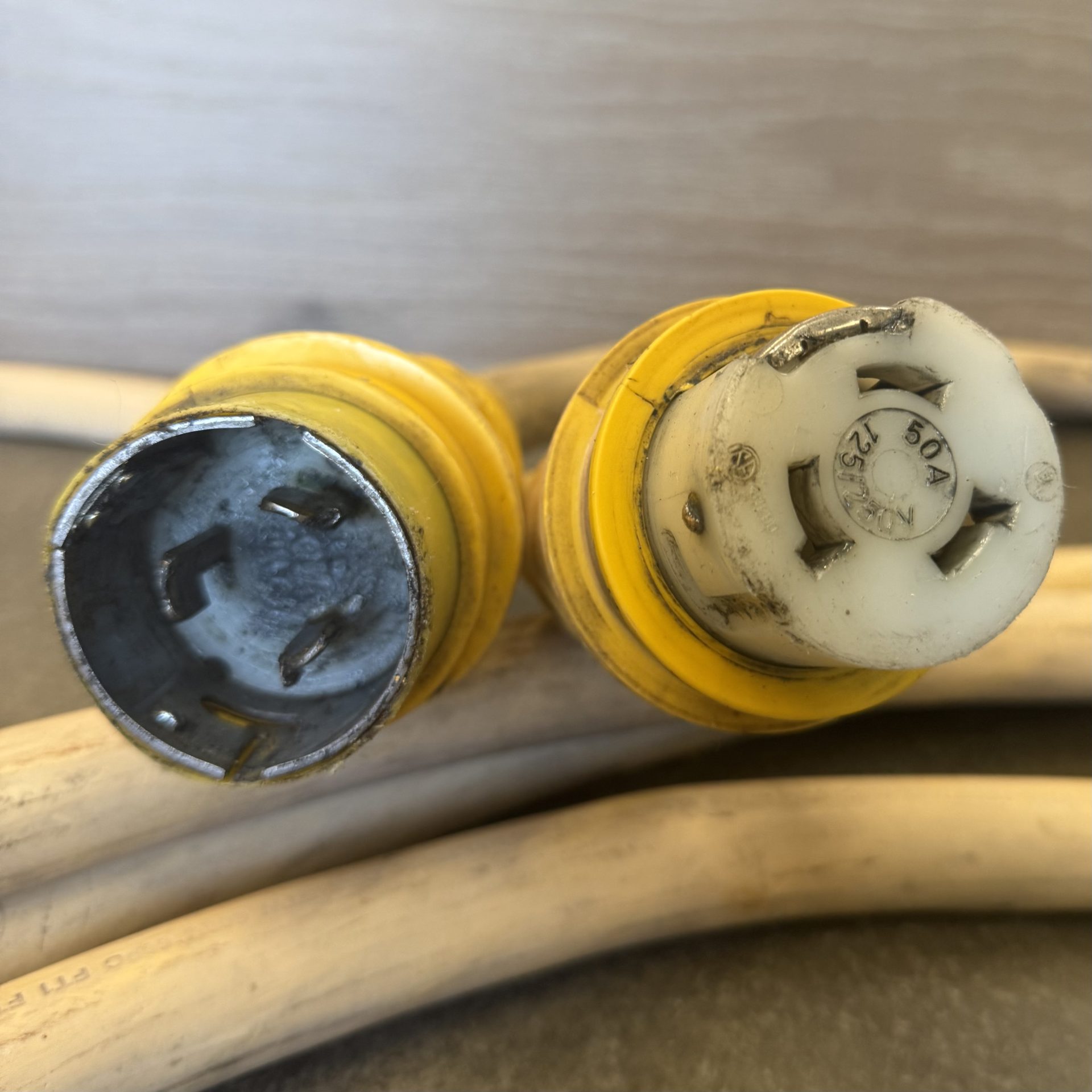 50Amp 125/250V Marine Grade Shore Power Cable – Yellow 50 Ft – Used Good Condition – Connections: (1) 3-spade female, (1) 3-spade male. Value $734