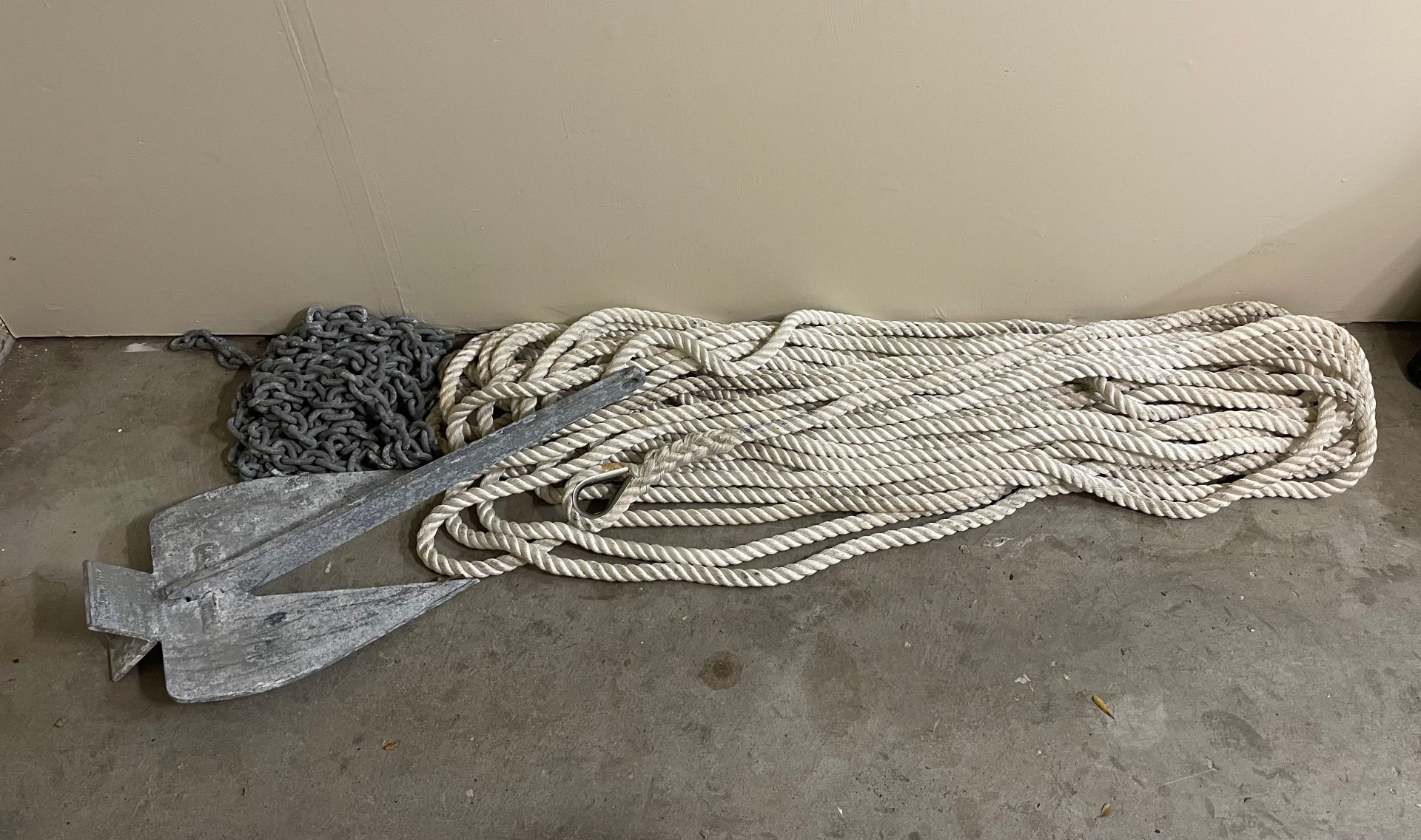 Galvanized Britany anchor (similar to Danforth) 5/16in galvanized G3 chain and 1in three-strand nylon rope rode. Anchor, rope never used, in like-new condition. Chain is lightly used, galvanizing in good shape.