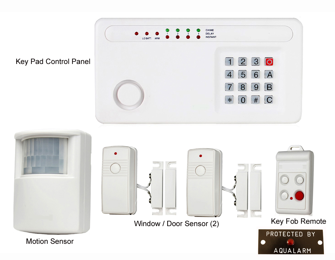 See aqualarm.net website Part 20410 for details. Includes keypad, motion sensors, window/door sensors, key fob, instructions and mounting templates. No wiring required. Expandable. Retails for $299