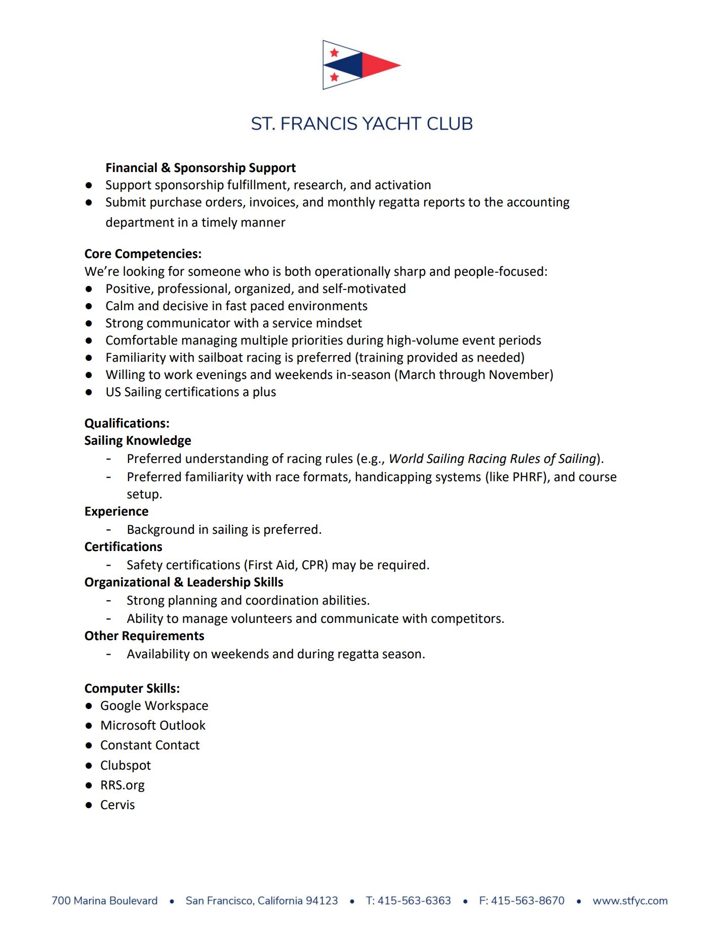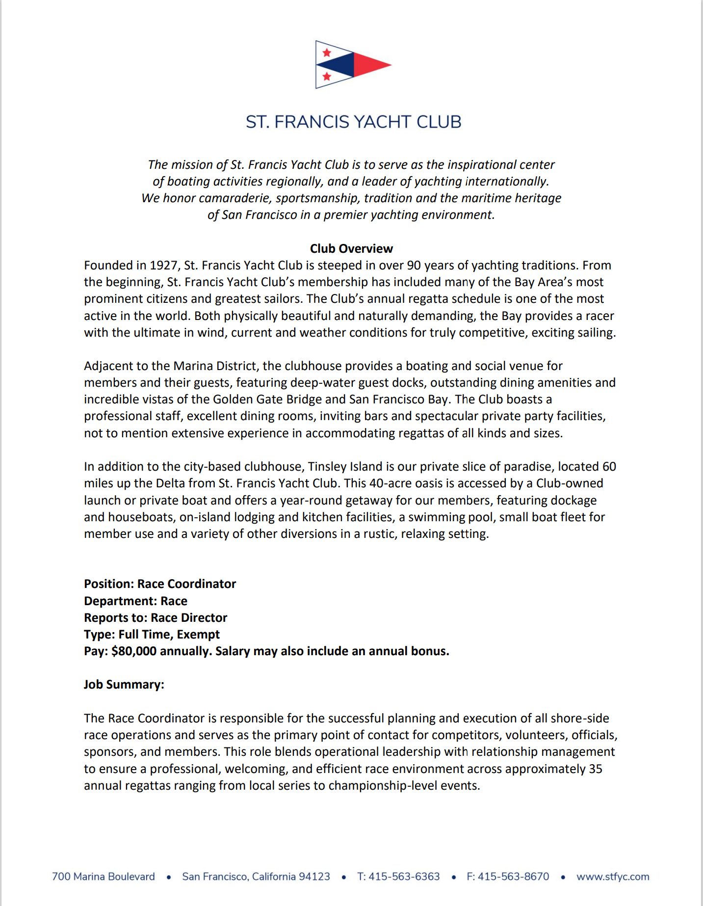 The Race Coordinator is responsible for the successful planning and execution of all shore-side race operations and serves as the primary point of contact for competitors, volunteers, officials, sponsors, and members. See photo gallery for more details