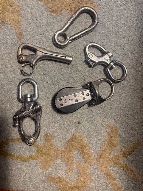 Various rigging items, all new, large one is a Gibb, all made in USA and in good working condition. Block is 4 1/2″ overall for reference.