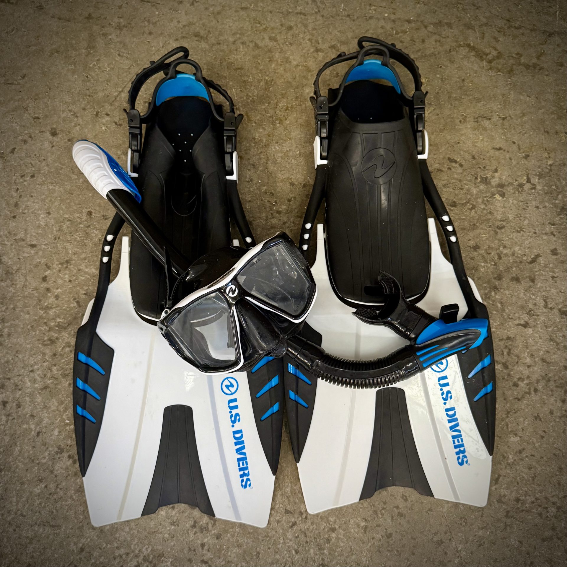 Two Snorkling Kits: U.S. Divers Matrix Adult Diving Fins, including 2-Window Mask + Dry-Top Snorkel, Water-draining bag. Adult Size: men 9-13 / women 10-14. Can purchase individual kit. Cost per kit $25, or set for $45