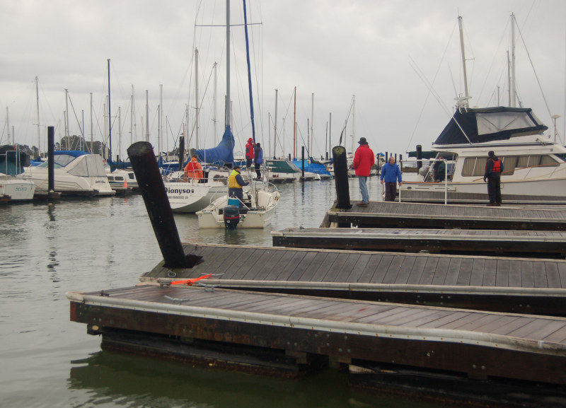 Elsewhere, marina staffs, liveaboards and other slipholders worked furiously to secure boats and gear throughout the Friday storm and during a smaller storm which followed on Saturday. Predictably, poorly secured roller-furling jibs led to dozens of boats lashing about wildly in their slips. At San Rafael’s Loch Lomond Marina wind-driven storm surge overran the outer breakwater and caused an entire row of docks to shift 30 feet. Amazingly, there was little or no boat damage. Loose gear in dry storage yards around the Bay Area became projectiles, as dozens of boats were toppled — especially lightweight daysailers.