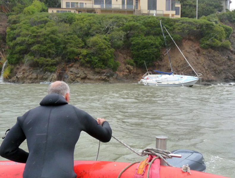 ‘Diver Dave’ Gissendaner rescues a 30-footer whose anchor dragged off Strawberry Point. “The pounding waves helped us pull her off,” he reports.