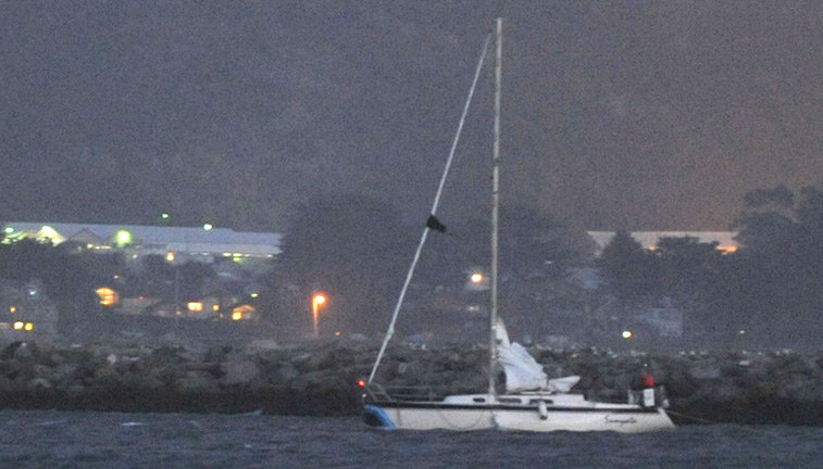 The wave-battered 34-ft sloop Sunyata was towed back to the Half Moon Bay anchorage Friday evening.