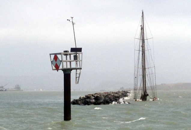 So Aldebaran sits awash on the Richmond Jetty, waiting for her own rescue. Brown says he’s fairly certain he and his crew can fix her ferrocement hull if they can get her raised soon, but the cost of such an operation could easily bankrupt the 77-year-old and his wife. They’re hoping friends and fans will contribute to their Go Fund Me fundraising campaign to restore the unique schooner. We wish the Browns and Aldebaran all the best for many more years of Bay sailing.