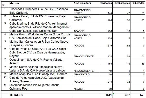 Tere Grossman, president of the Mexican Marina Owners Association, has provided us with a list, complements of the AGACE, of the boats that were ‘Reviewed’, ‘Embargoed’, and ‘Liberated’ in Mexico.