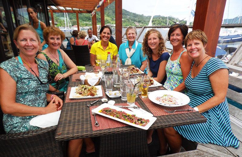 A great group of women circumnavigators-to-be lunching at Bora Bora. Left front: Laurie (and Richard) Owen on Nexus, a US-based 58-ft semi-custom cat; Left back: Jenny (and Jonathan) Crowe on Merlyn of Poole, an Oyster 45 from Great Britain; Back center: Suzana Buraca, World ARC Rally Control; Right back: Cathy (and Charlie) Simon of the Spokane / Nuevo Vallarta-based Taswell 58 Celebrate; Next right: Sandra (and Tom) Frank on Sweet Pear, a Switzerland based Outborn 44l; Right center: Dawn (and Michael) Roberts on ViVo, a US-based F/P 60-foot cat; Right front: Tracey (and Tim) Ramsey on Folie a Deux, a U.S.-based More »