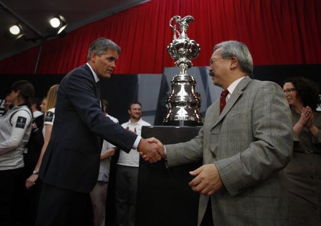 Sir Russell Coutts (l) and San Francisco Mayor Ed Lee shake hands after agreeing to bring the 34th America’s Cup to San Francisco in 2013.