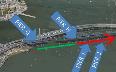 As of Monday, CalTrans had cleared the main channel of the old and new east spans of the San Francisco-Oakland Bay Bridge between piers G and H. This is the main channel span closest to the east side of Yerba Buena Island. More »