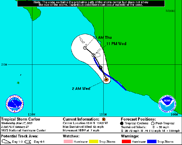 Depending on what source you refer to, current/former Hurricane Carlos, currently paralleling the coast of mainland Mexico about 100 miles off Lazaro Cardenas with 70 knots of wind, is: 1) Going to head further out to sea and pretty much be a non-issue; 2) Gather more steam and head toward Cabo Corrientes and threaten Banderas Bay; 3) Going to be less of an issue all the time right where she is. More »