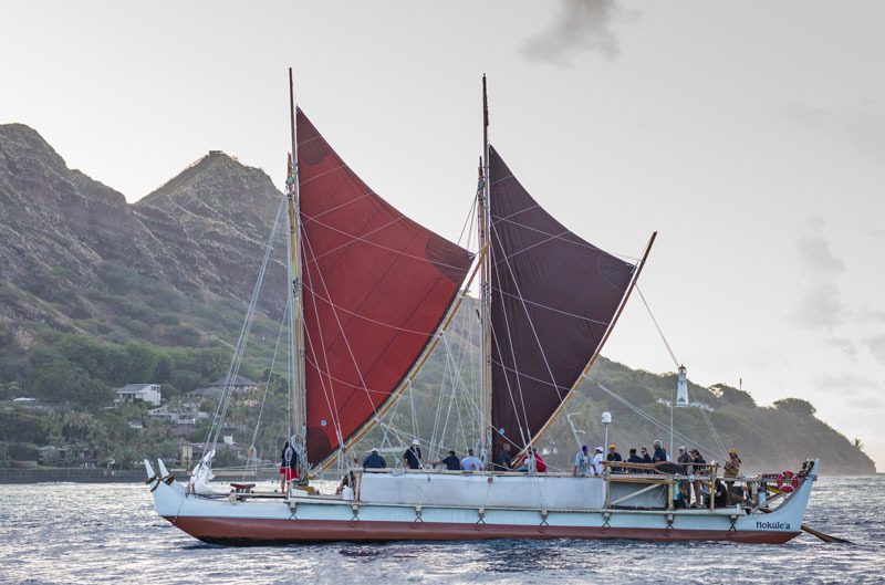 The wa’a Hokule’a sails into Waikiki Bay, wrapping up her circumnavigation of the globe.