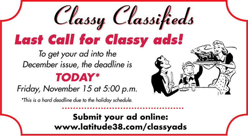 Last call for Classy Classifieds. To get your ad into the December issue, the deadline is today, the 15th, at 5 p.m.