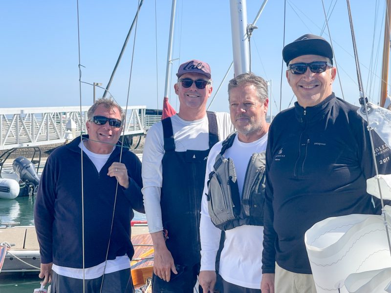 “There were tons of shifts, and the left side paid off big-time in the first few races,” Tommy Finnegan, the bowman for Mark Dahm’s team Benino (StFYC), tells Latitude. “[Monday] and Sunday it was 12-15 knots …. [The] Vakaros system has been cool to use. It gives you distance to the line, and calls you OCS via GPS, so there’s no hiding from the race committee. Vakaros has made everyone super-cautious on the line. There’s been no U-flag, so that’s been great. There was no racing [on Tuesday]; we were postponed until 1:30 and then we saw AP over Alpha, so I spent the rest of the day at the bar.”