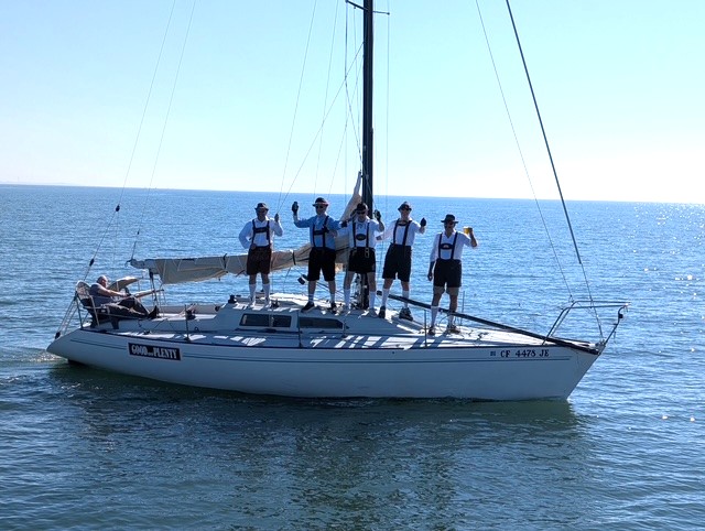 To encourage creativity in costumes, three seconds per mile were be added for each crew member wearing Bavarian lederhosen or a dirndl, and creative license was allowed, as long as it was in the “spirit of lederhosen,” as determined by the race committee. And there were some great costumes! A couple of examples: Flying Fish (OYC) and Tramp Boat (IYC).