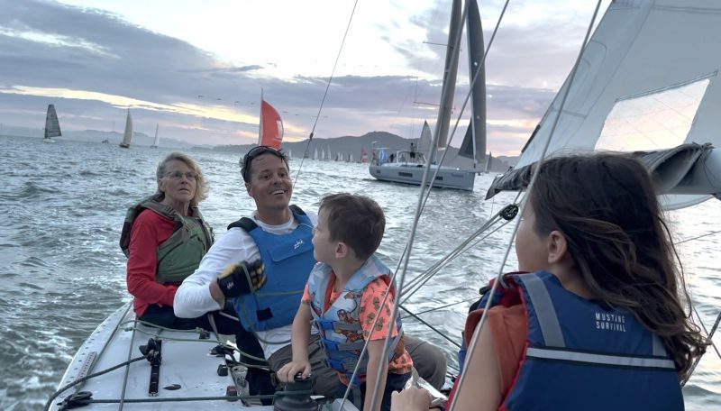 Ted Floyd graciously joined the s***show program as guest trimmer. I was just screwing around on foredeck due to a wrist injury, though there was plenty of foredeck work to be done. My 8-year-old daughter Ellie was properly dressed in her junior sailing wetsuit and K-Pop Demon Hunters Halloween costume, munching on candy the RC had tossed to her before the start.