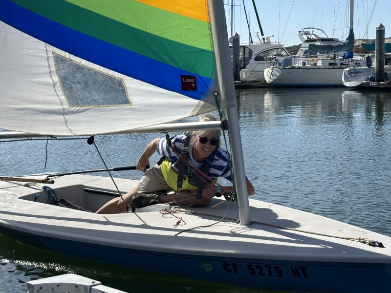 The course was one or two laps from the north end of the marina in Moss Landing North Harbor, around the last outbound channel marker and back, with a turn buoy when needed, mostly a beam reach both ways. Racers were obliged to navigate around novice kayakers heading up the popular Elkhorn Slough, SUPs, sportfishing boats coming and going from three ramps, and active dredging operations in the channel. And of course, each other, as Lasers and Lidos lapped the eight-ft-and-under division despite the staggered starts.