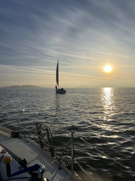 The next run to 8 saw every boat reach for its downwind tricks — spinnakers unfurling, poles swinging, sails trembling for any breath of motion. Paradigm, powered by her chute, once again overtook Sweet Grapes. Sirius, defeated by the fading wind, retired from the race. For a moment the talk was of shortening the course, but the ebb had arrived — slow, steady, and on our side. It would carry us to Z more quickly, and so we pressed on.