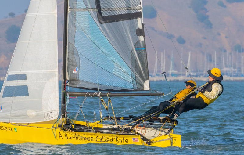 Another angle on our cover sailors this month: Rand Arnold and Gary Gremaux are out on the wire aboard their International 14, A Bumblebee Named Kate. The pair were racing in Richmond Yacht Club’s Small Boat Midwinters earlier this month. While much of the Bay Area was lamenting being shrouded in gloomy, chilled fog, sailors in the Small Boat Midwinters off the Richmond Riviera were relishing blue sky and sunshine. There were over 100 boats signed up, and just under 100 raced on December 7.