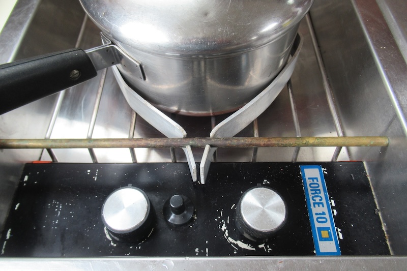 These improvised holders worked well for me on the rolling Pacific. I rarely used more than one pan at sea, and a single set was adequate. As an aside, I used a tall pan to mitigate the lack of gimbals, which had no bearing on the pot holder’s functionality.