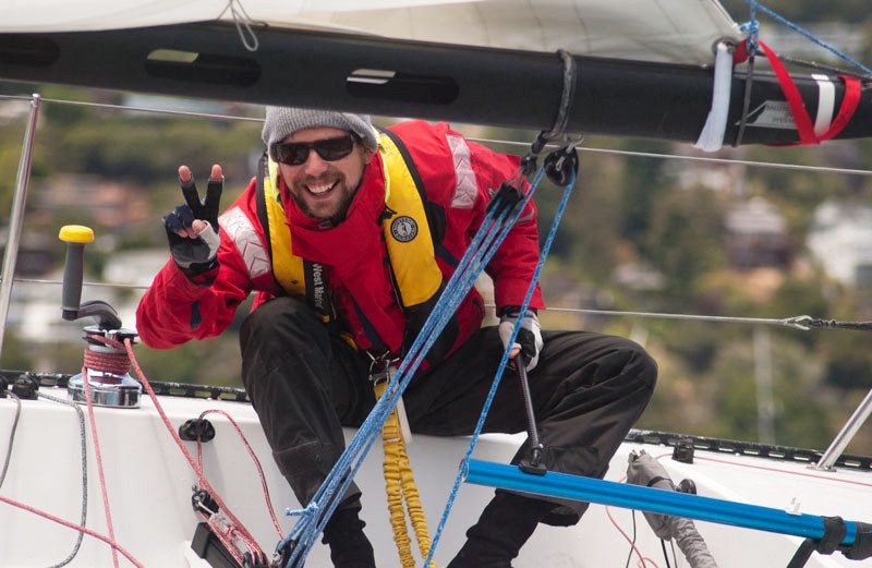 Finishing in the rain, Jirí Šenkyrík circles his Olson 30 Kato around to meet the shore boat after finishing the Singlehanded TransPac. Born in the Czech Republic, Jirí flew the Czech flag at the start and finish. More »