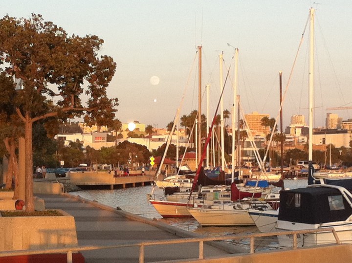 Right after we took that shot, we glanced to the east and saw a whopper of a moon coming up over the boats moored on the first row of the Laurel Street mooring field. It looked as if it might have been full, but we’ve since done a little research, and it turns out that not only is tonight’s moon full, it’s a ‘blue moon’. We know some of you think this means there is some kind of astronomical reason for the moon to come up the color blue tonight. Alas, it’s not going to be blue at all, it just means that it’s the second full moon of the month, something that only occurs once this year and not again until ’15. Why do they call it ‘blue’? Because back in the Middle Ages it was known as the ‘betrayal moon’ because it didn’t wait for the next month, and ‘blue’ sounds like ‘betrayal’ in French. Of course, after the giant volcanic eruption of 1883 in Indonesia, the volcanic dust actually did make the moon look blue. It was the orgin of the saying ‘once in a blue moon’.
