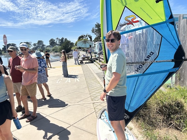 We chatted with new members Turi McCarthy and Gideon Pearsall, who are drawn to the Cal Sailing programs as a “low cost way of gaining the skills needed” to operate their own boat they’re planning to buy soon. Several women who joined our conversation felt the sailing dinghies were too complicated to learn, so they opted to begin their learning process on a windsurfing board instead. The open house on Easter Sunday drew 187 adults and 30 kids (minimum age is 5), so those planning to attend should arrive well before the 1 p.m. start time. Life jackets are provided, and windsurfing instruction by the Club is a fun way to pass the time while waiting in line!