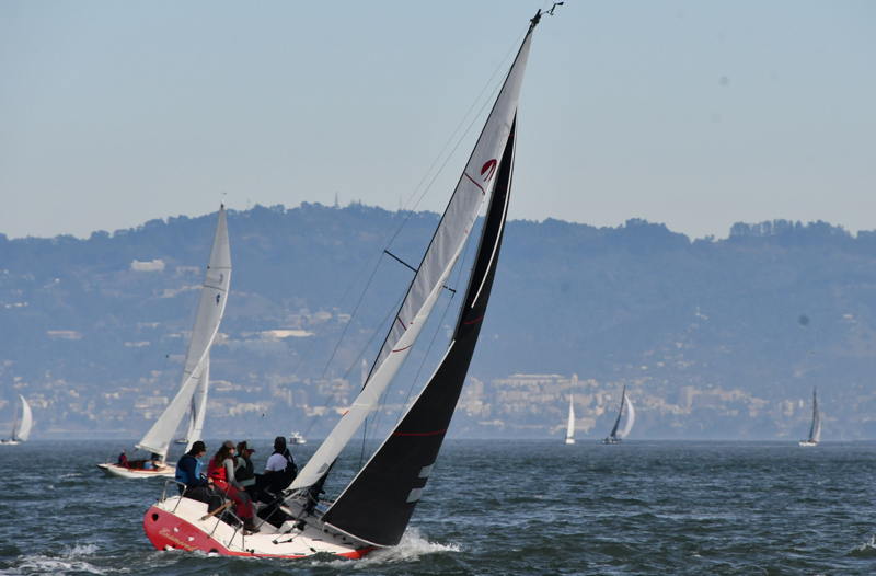 Current predictions help, but they don’t show you where the wind will be. That’s part of the puzzle that makes racing the Bay so much fun. Do you round Blackaller and reach off to Crissy Field to get out of the ebb as you head toward the Phil Perkins buoy off Fort Mason? Or do you stay farther off the beach where you have more breeze to help you sail into the teeth of the ebb? Every boat found its lane to sail right up to the wind hole off Fort Mason. Fortunately, the wind returned with enough force to get everyone around and heading home.
