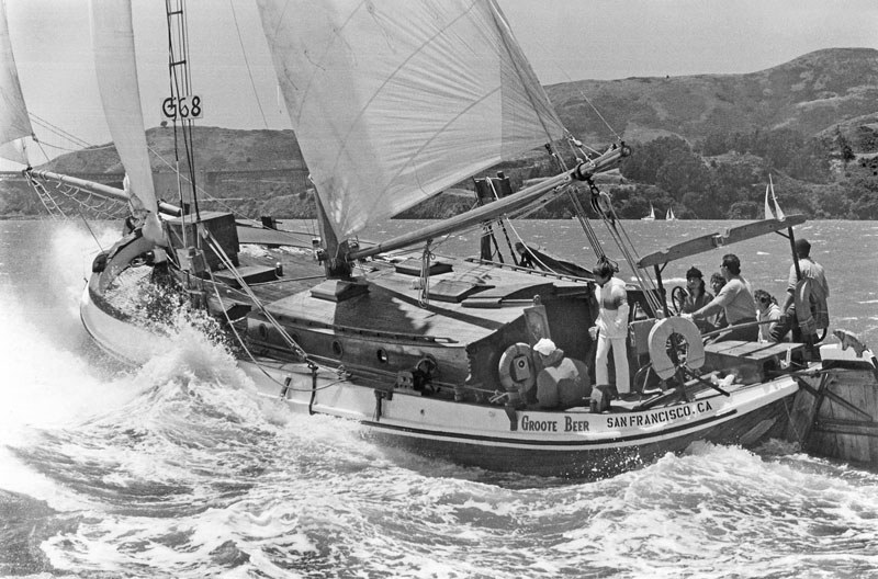 Over the past few decades, other significant Bay-based homeward bounders included the 52-ft ‘botteryacht’ Groote Beer (Great Bear), the splendid Dutch sailing barge that was ordered by a Nazi during the war — but continuously delayed by her Dutch builder and never delivered. Incredibly, what is essentially a large, flat-bottomed Dutch canal boat with twin leeboards sailed across several oceans in her career (including the ’57 Transpac) before ending up on the Bay. Under the ownership of Cliff and Ruth Ann Fremstad, she often competed in the Master Mariners Regattas in the 1980s. In 2001, she returned to Holland where she was restored and is on display.