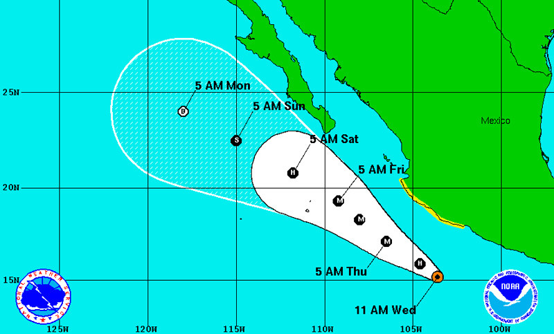 With her center currently located roughly 200 miles southwest of Acapulco, a storm watch is in effect from Lazaro Cardenas to Cabo Corrientes. The National Oceanographic and Atmospheric Administration (NOAA) Hurricane Center predicts the eye will pass Puerto Vallarta in the early hours of Friday morning, and will pass Cabo San Lucas approximately 24 hours later.