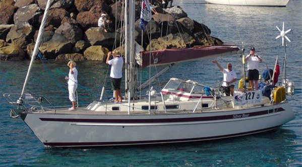 In the second incident, Silver Bear, ARC entry #227, came into radio contact with a couple of guys doublehanding the Atlantic on a similar course aboard the Sadler 25 Star Fire. They were not part of the ARC. While still 1,700 miles from the nearest island, the small boat had snapped her rudder after hitting something in the water. Although the crew was able to fashion a rudder out of bits of cupboard and stuff, their progress was slow. Nonetheless, Ray Lawry, skipper of Silver Bear, made the decision to slow down signifiantly in order to escort the smaller boat for the nearly 2,000 remaining miles to St. Lucia.