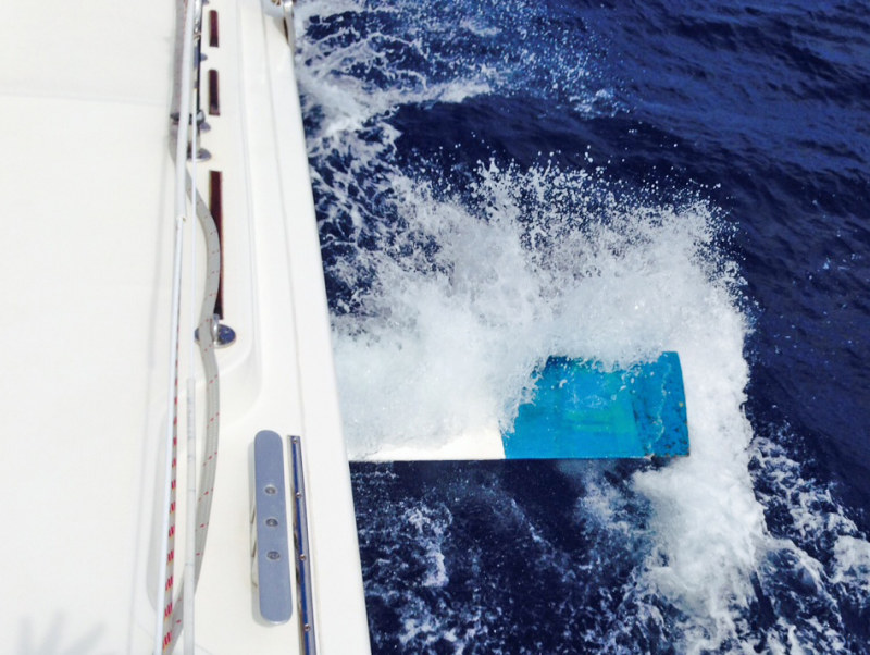 Judging from a quick glance, it looks as though this photo depicts Greg and Debbie Dorland’s Lake Tahoe-based Catana 52 Escapade making a bid to become the first multihull with canting daggerboards. But photos can be deceiving, as it’s actually a shot of one of the two — count ’em! — daggerboards they broke while sailing upwind in rough weather from the boat’s summer home in Curaçao to St. Barth in the French West Indies. The good news is that replacement daggerboards from Catana weren’t that expensive — just $9,800 each, plus shipping, from France.