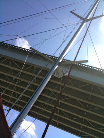 As any sailor knows, approaching a bridge with a relatively low — but doable — clearance can really get your blood pumping. Even if the chart indicates you’ll have 20 feet of clear air between the top of your mast and the bridge, from deck level it always looks like you’re headed straight for a dismasting. So imagine the cojones it takes to plan a trip under a bridge with 70 feet of clearance (at mean high water) when your mast sticks up 71 feet! That’s just what Laurie Chaikin and her crew did last month when they took a trip to Petaluma on her Leopard 45 Charleette II.