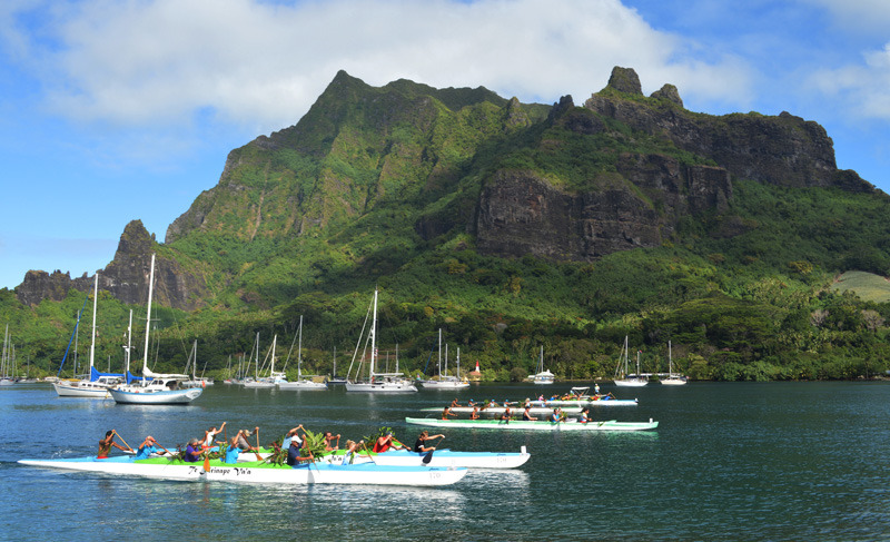 As in years past, Sunday’s schedule was focused on traditional Polynesian sports, the highlight of which was a series of six-person outrigger canoe races staged on the bay’s idyllic lagoon. We’re certain that all who paddled in those heart-pounding sprints beneath the towering peaks of Mt. Rotui (top photo) will not soon forget the experience.