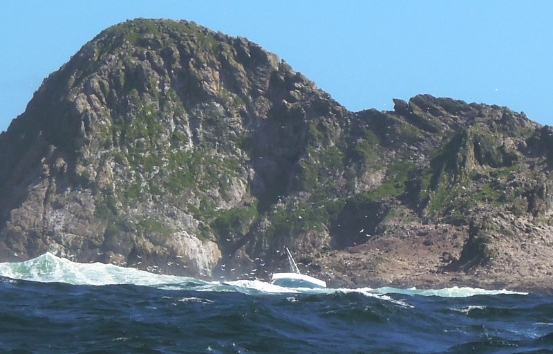 Michael Moradzadeh, who called in the mayday, reports: "Approaching, and then rounding, Southeast Farallon Island from the north at a distance of about a quarter mile, we observed heavy surf on the islands, crashing high and putting on a display of the sea’s power. Aboard Green Buffalo, our skipper noted a ‘sweeping wave,’ originating at about our distance and sweeping toward the south end of the island. He also noticed a white spar, deep in one of the coves, and called our attention to it.